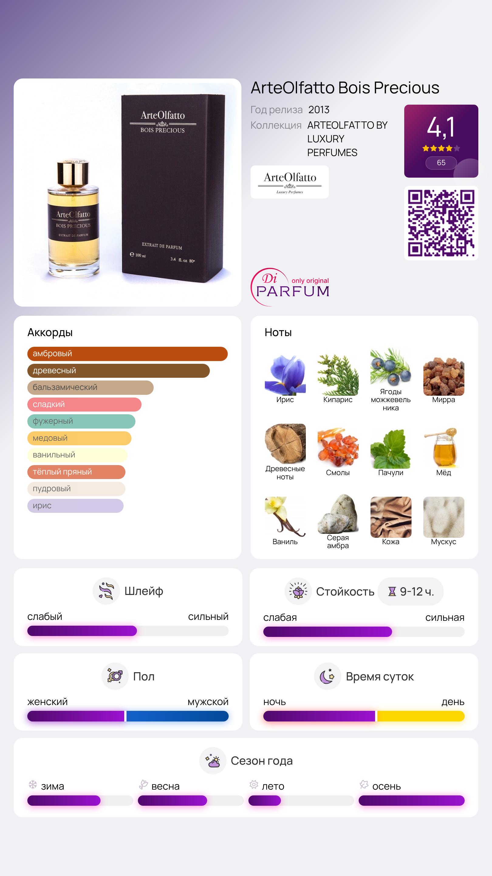 Созданный в 2014 году, ориентальный эликсир Bois Precious от ArteOlfatto оставляет роскошный шлейф, наполняя пространство ароматом королевской кожи, восточной серой амбры и чувственного мускуса. Терпко-пряные ноты гармонично сочетаются с сладкими нюансами целебного меда и интригующей ванили.