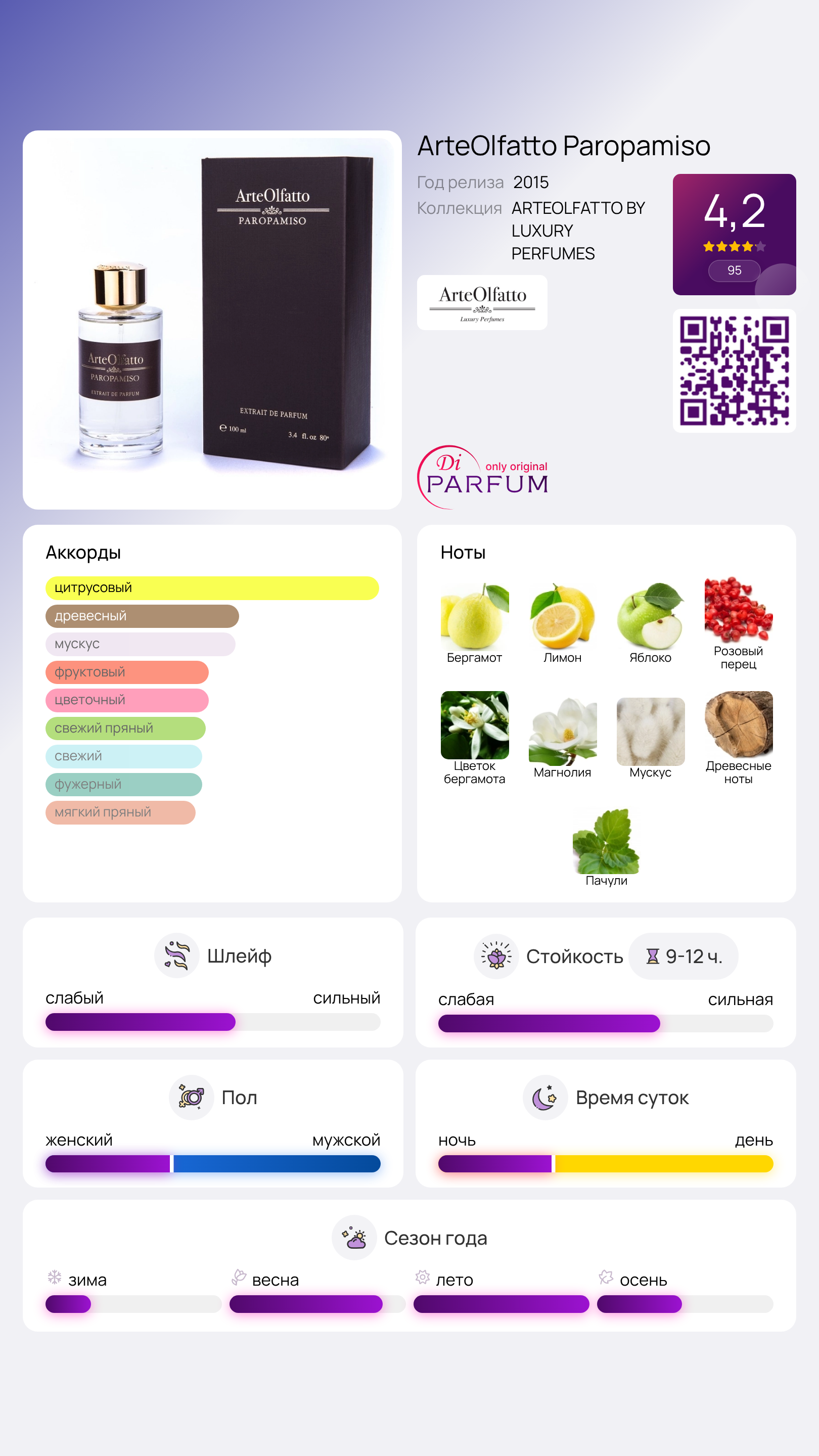 Композиция Paropamiso от ArteOlfatto, представленная итальянским брендом в 2015 году, выделяется своей энергией, простотой и яркостью звучания. Этот искрящийся эликсир наполняет жизненной энергией и настроением оптимизма, необходимым для достижения желаемых целей.