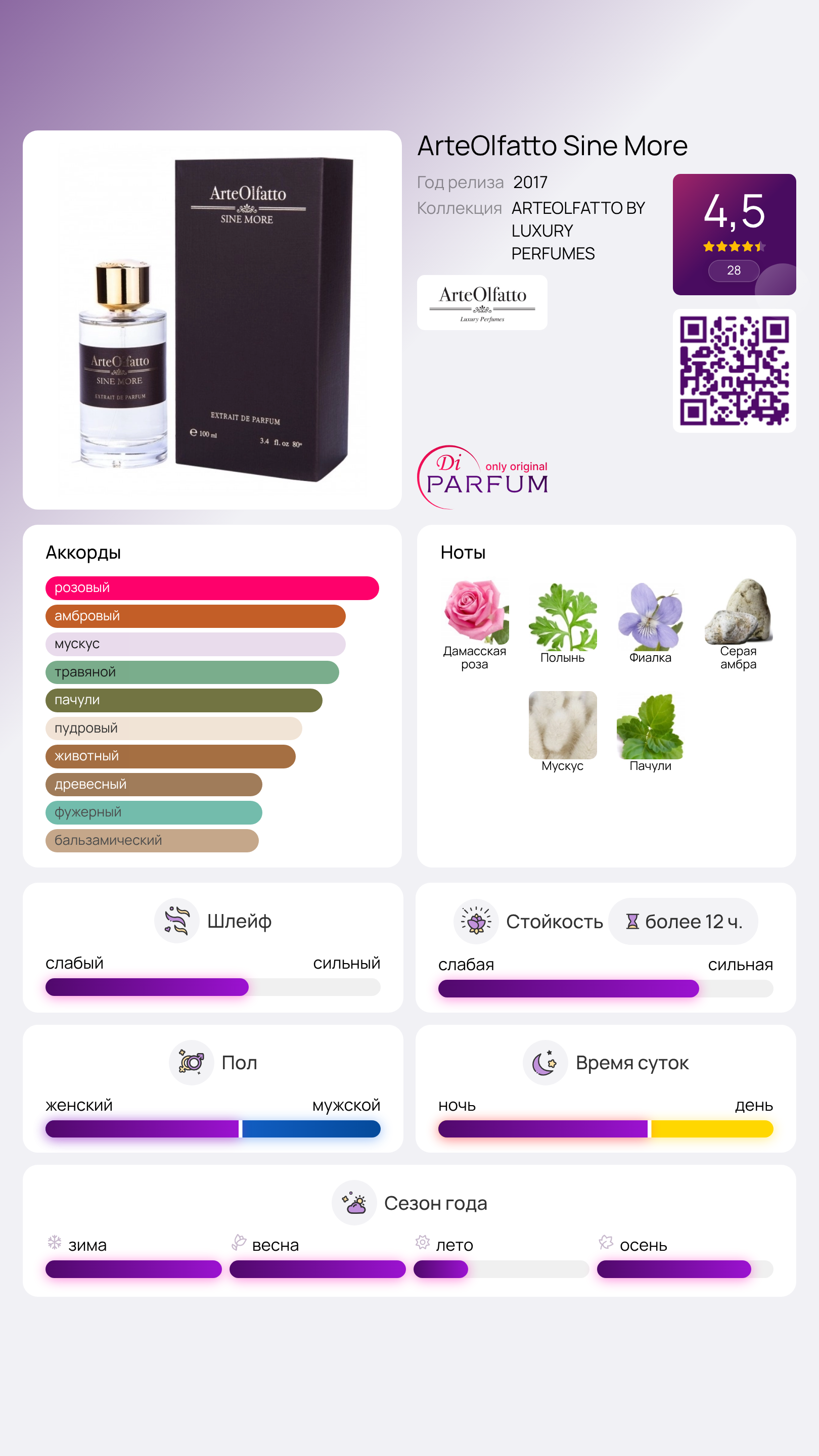 ArteOlfatto Sine More — это яркая восточно-цветочная композиция, олицетворяющая искушение. В ней господствует завораживающий аромат роз, произрастающих в идиллическом уголке. Этот аромат переполнен великолепием цветочного букета, который дополняется древесно-пряными нотами.