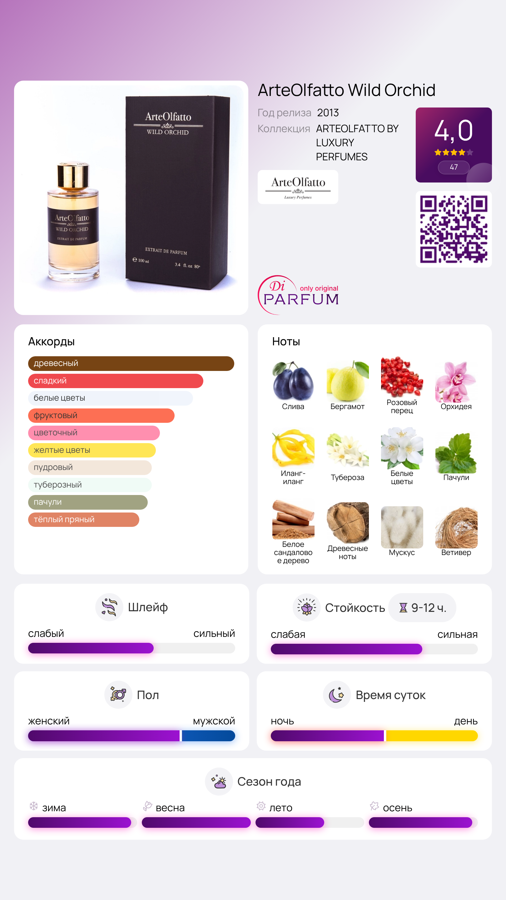 Парфюмерная композиция Wild Orchid от ArteOlfatto полностью соответствует своему названию. Мастера renommiertого итальянского бренда смогли запечатлеть основные ноты дикой орхидеи в идеальном оформлении, создав восхитительный восточно-цветочный аромат, который завораживает ценителей своей безупречной ольфакторной пирамидой начиная с 2013 года.