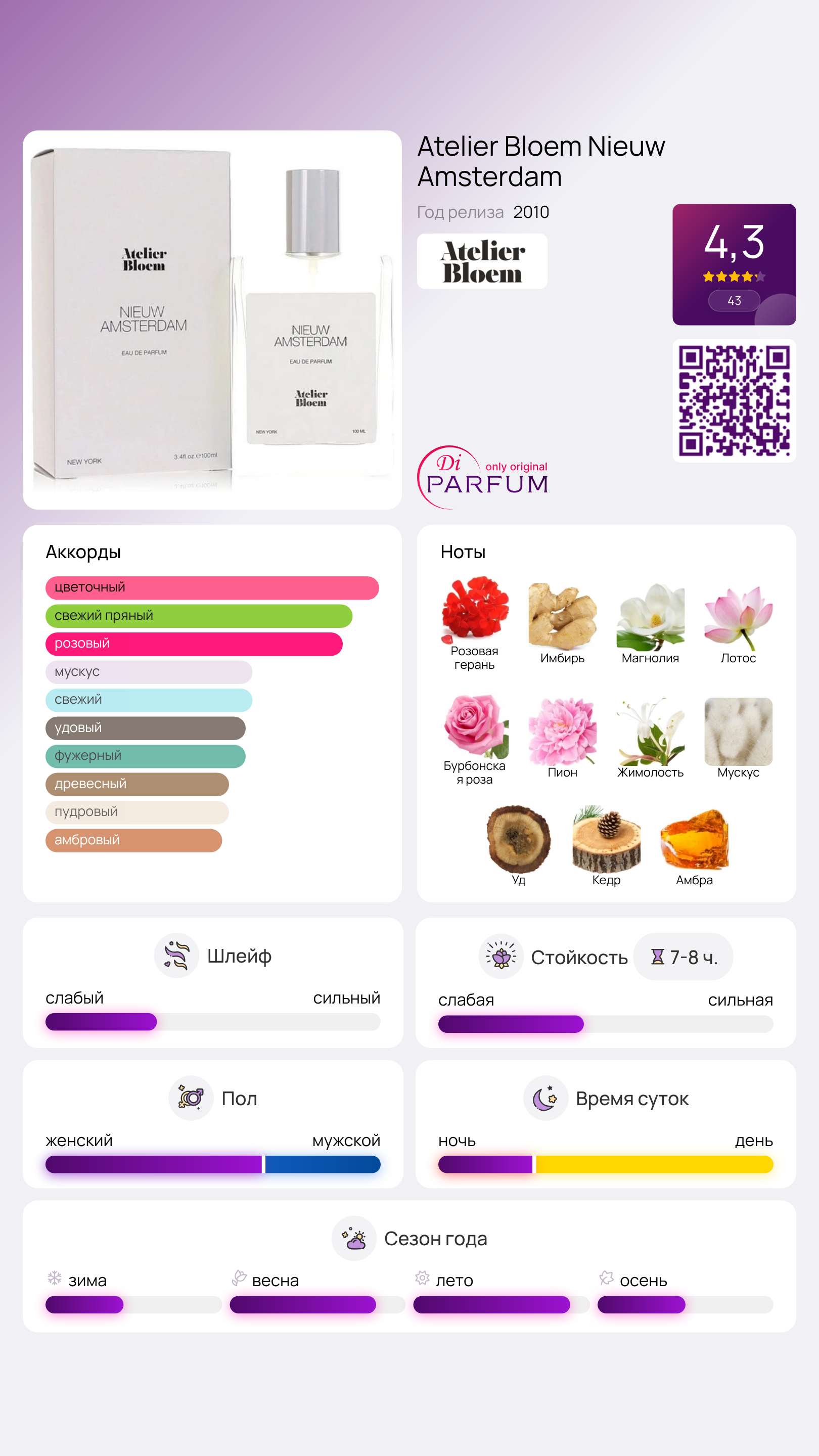 Парфюм Atelier Bloem Nieuw Amsterdam представляет собой гармоничное решение для повседневного использования мужчин. Он отлично подойдет в любой ситуации — будь то деловая встреча, романтическое свидание или отдых, добавляя изысканности и привлекая внимание. Его задача не в том, чтобы шокировать, а в том, чтобы мягко сопутствовать своему владельцу, ненавязчиво подчеркивая его присутствие.