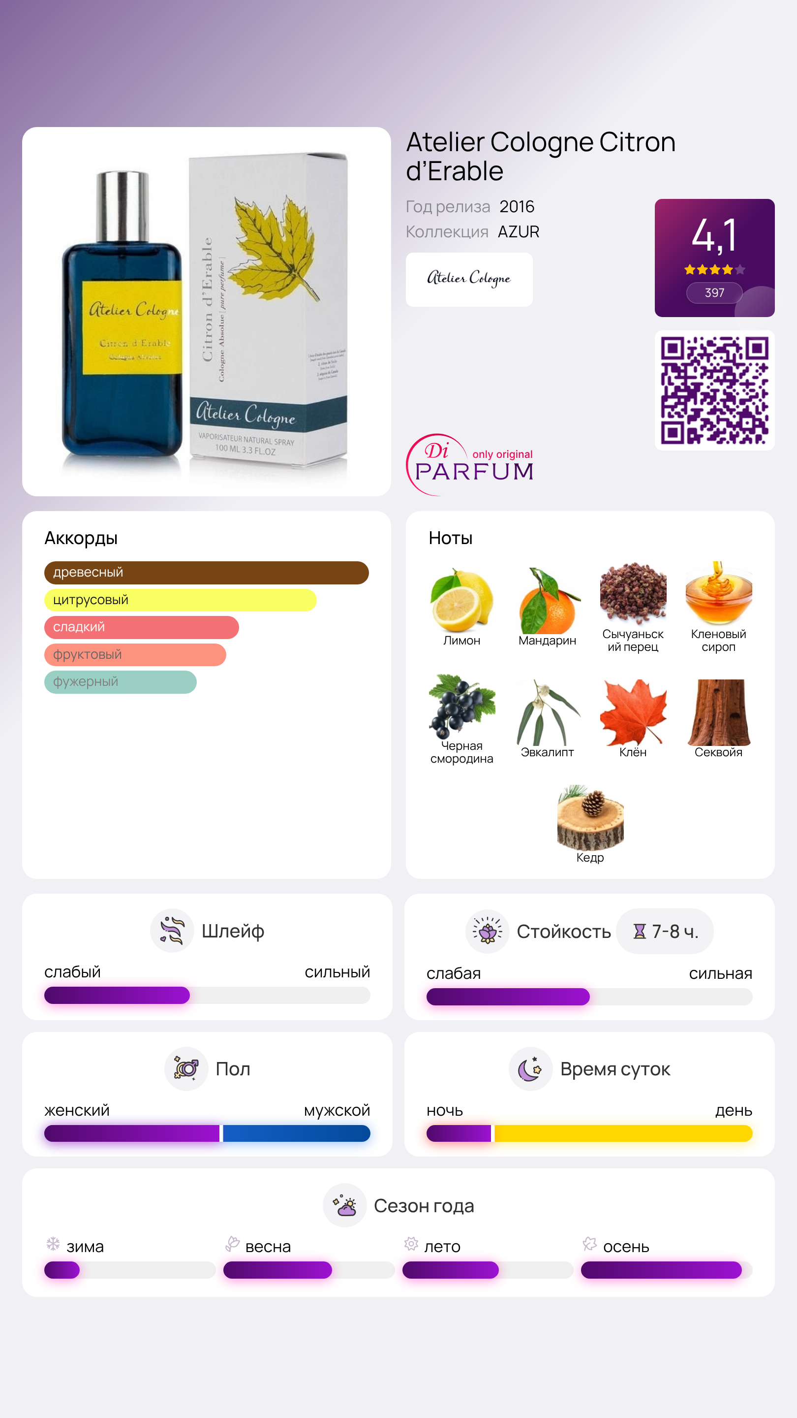 Ароматные ощущения создаются за счет сочных лимонных долек, дополненных кленовым сиропом. В начальных нотах можно почувствовать лимон, мандарин и немного китайского перца. Сердце аромата состоит из кленового сиропа, черной смородины и эвкалипта. Завершающий аккорд формируют клен, секвойя и белый кедр, который гармонично перекликается с предыдущими компонентами.