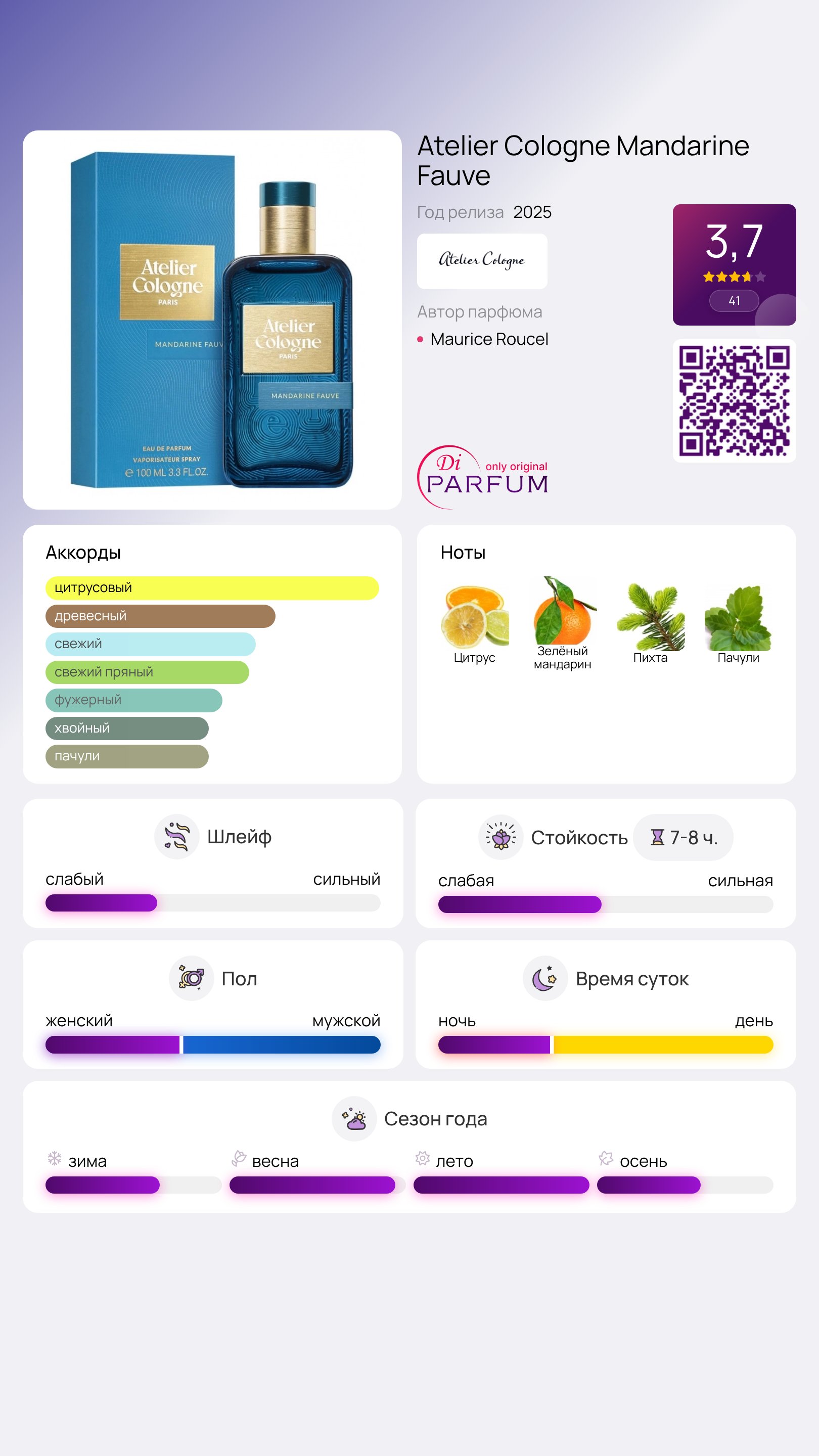 Базовые ноты аромата состоят из свежих и выразительных ароматов ели и пачули, создавая тем самым природный и освежающий древесный шлейф. Mandarine Fauve идеально подходит для теплого времени года, наполняя ваш день энергией и позитивом. Этот аромат станет отличным выбором для тех, кто ценит оригинальность и глубокие фруктовые ноты.
