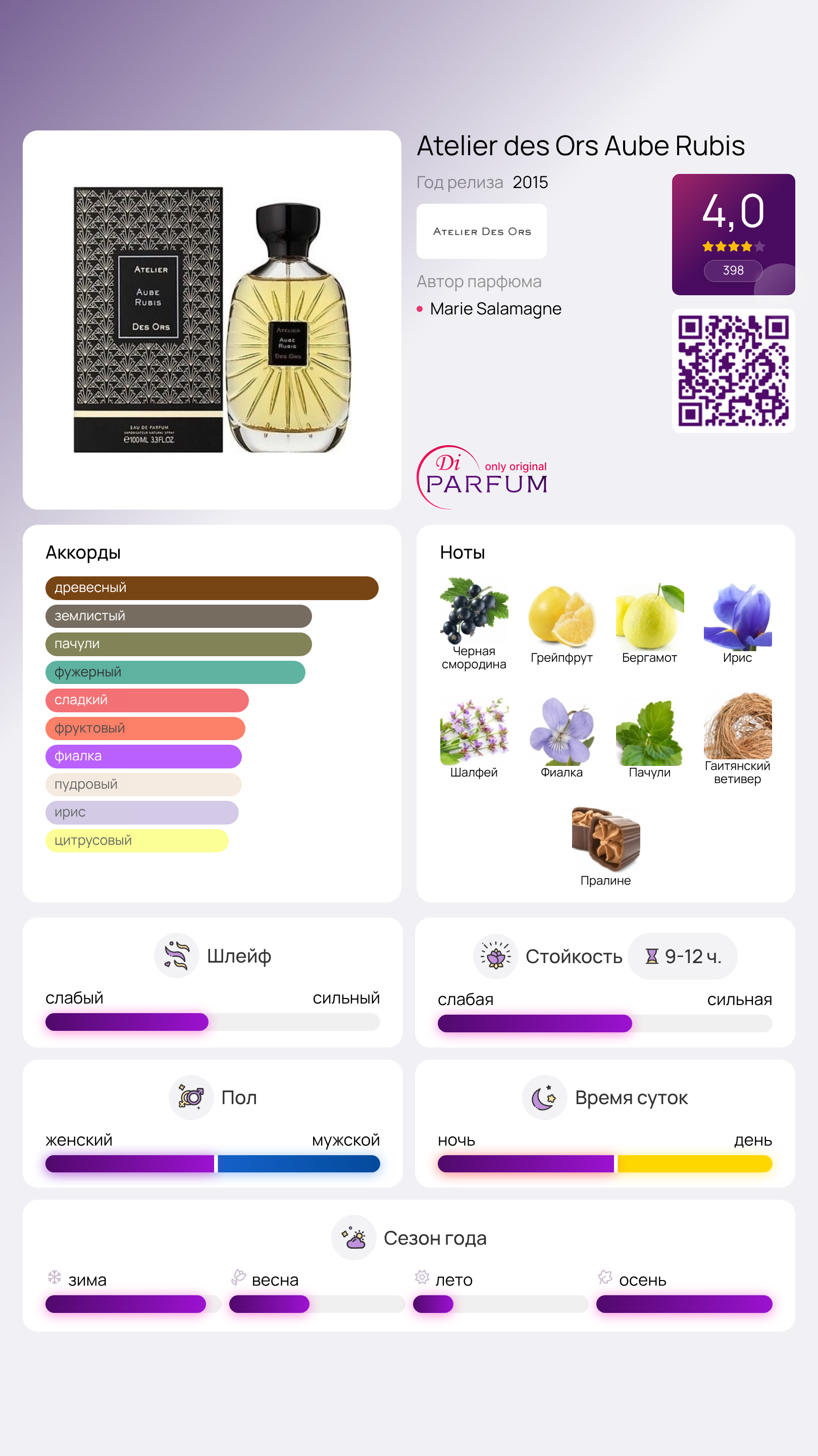 Парфюм Atelier des Ors Aube Rubis представляет собой великолепную фруктово-фужерную композицию, символизирующую эпоху Возрождения. Этот аромат приглашает забыть о повседневной суете и окунуться в атмосферу лета, полную беззаботности и гармонии между внутренним и внешним миром. Он был представлен в 2015 году как часть коллекции из 11 ароматов, созданных с участием Мари Саламань.
