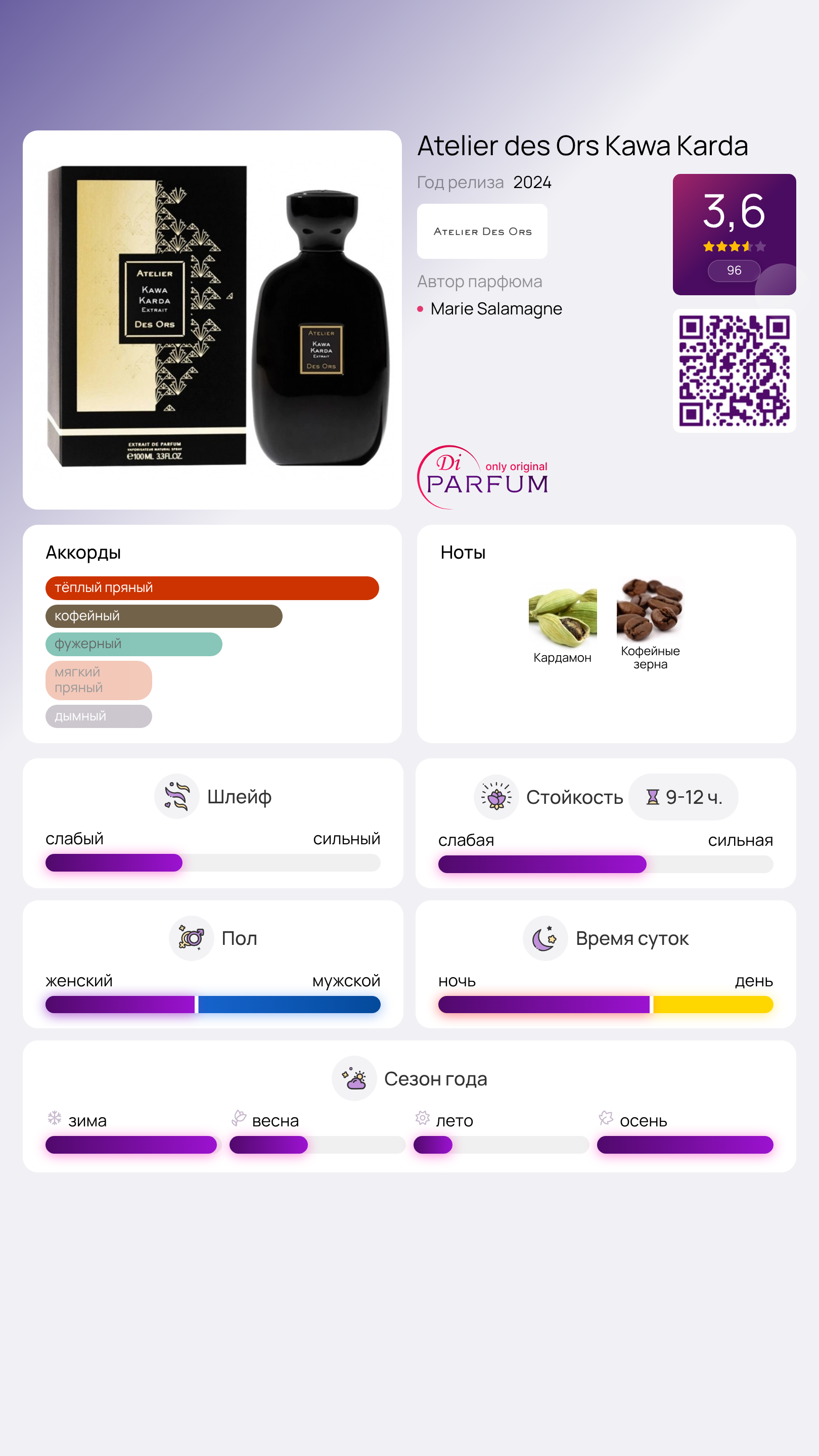 Этот парфюм относится к шипровым семействам, что добавляет ему особую элегантность и сложность. Ноты кофе придают композиции не только насыщенность, но и бодрящий эффект, а кардамон добавляет теплоты и утонченности. Редкие и экстраординарные ингредиенты делают Kawa Karda настоящим произведением искусства.