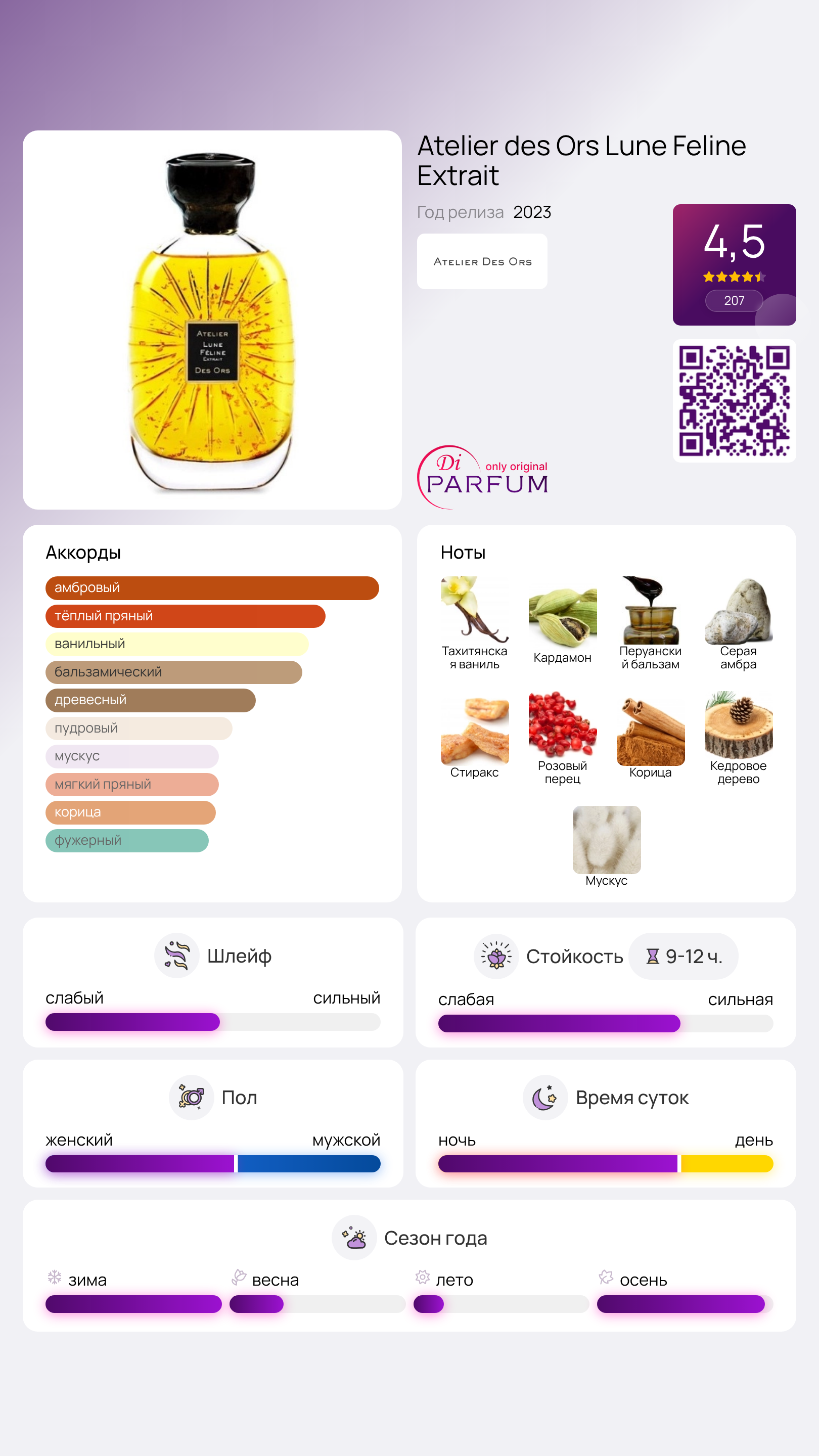 Смолистый и тягучий перуанский бальзам указывает на пряные акценты, а таитянская ваниль добавляет гурманские оттенки, переплетаясь с легким, прозрачным мускусом, формируя нежный, но ощутимый шлейф Atelier des Ors Lune Feline Extrait.