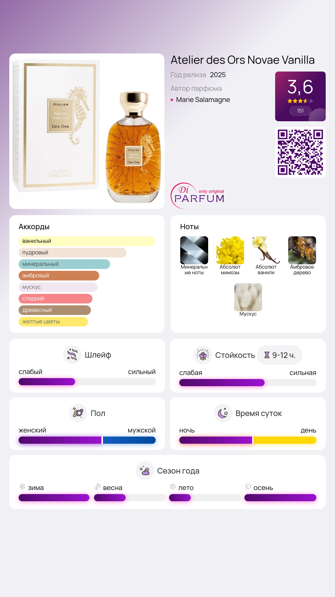 Аромат относится к семейству гурманских и восточных композиций. Ноты аромата включают: минеральные ноты, мимозу, абсолют ванили, бурбонскую ваниль, мадагаскарскую ваниль, амберные ноты, мускус. Это делает Novae Vanilla идеальным выбором для тех, кто ценит уникальные и выразительные ароматы, способные добавить роскошь и загадочность в каждый день.