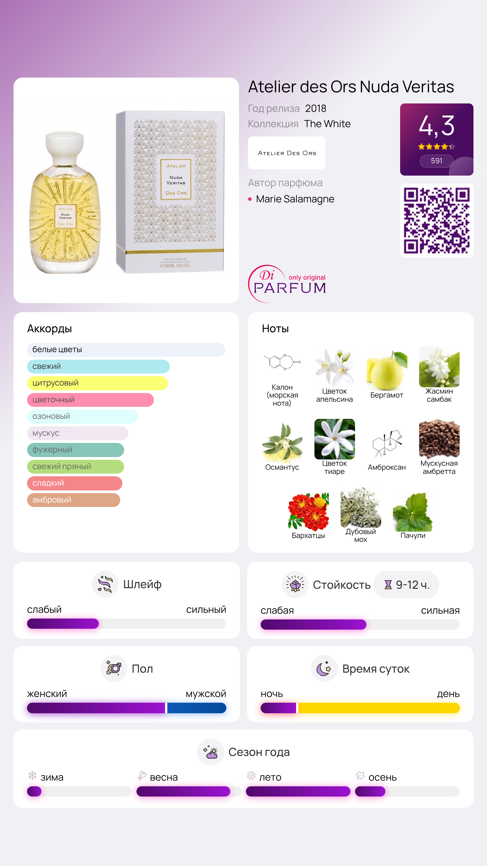 Чистота композиции Nuda Veritas от Atelier des Ors отражает беззаботные мгновения жизни. Этот аромат был представлен в 2018 году как часть трио White Collection, посвященного утонченной красоте простых радостей. Во флаконе, излучающем свет, сверкает золотистый шиммер.