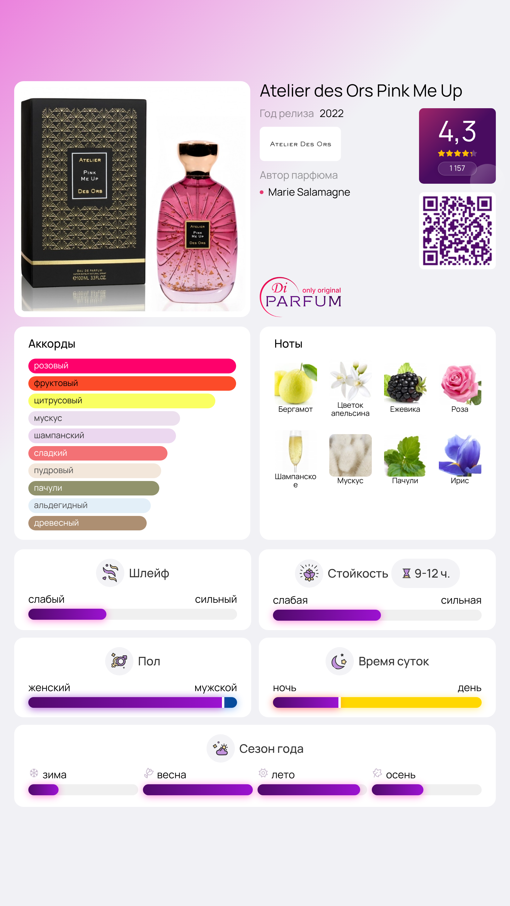 Аромат Atelier des Ors Pink Me Up скрывает за своим пурпурным, шелковистым шлейфом тщательно продуманную ольфакторную пирамиду. Она передает единую мысль: истинная женская красота исходит изнутри и освещает жизненный путь, подобно лампе, дарующей свет.