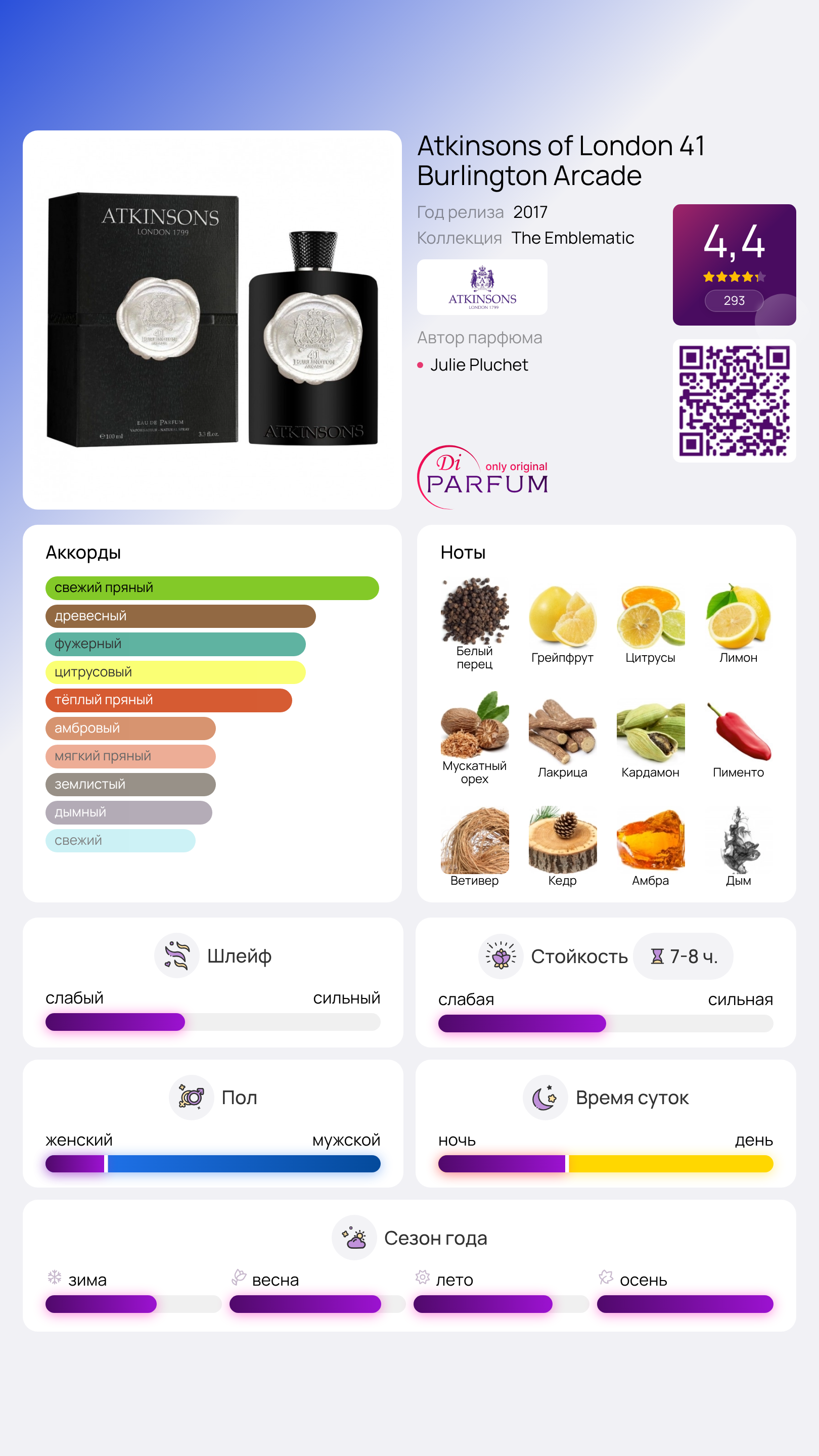 Atkinsons of London представляет собой один из самых старых и высоко ценимых домов парфюмерии в Англии. Парфюмеры этой марки строго придерживаются традиционных норм и предлагают ароматы выдающегося качества. В 2017 году серия The Emblematic Collection, олицетворяющая историю и наследие бренда, пополнилась новым парфюмом – статусным ароматом Atkinsons 41 Burlington Arcade. Этот аромат получил свое название в честь адреса нового фирменного магазина в Лондоне, что делает его знакомым для жителей города и поклонников марки.