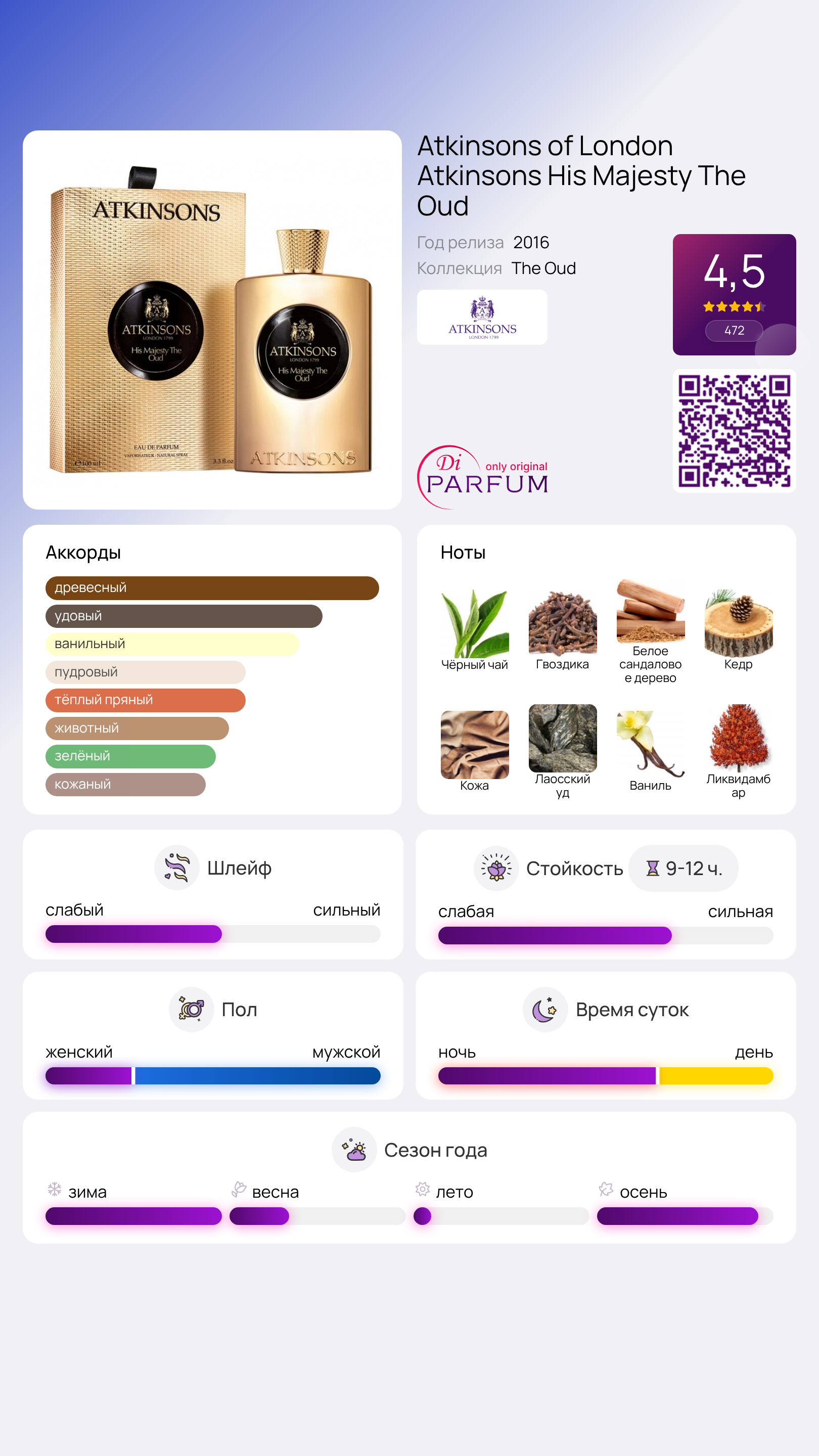 В 2016 году бренд Atkinsons выпустил мужскую версию аромата His Majesty The Oud, вдохновленную женской композицией Her Majesty The Oud. В холодный зимний вечер трудно представить себе что-то лучшее, чем наслаждение чаем с ванильным десертом у камина.