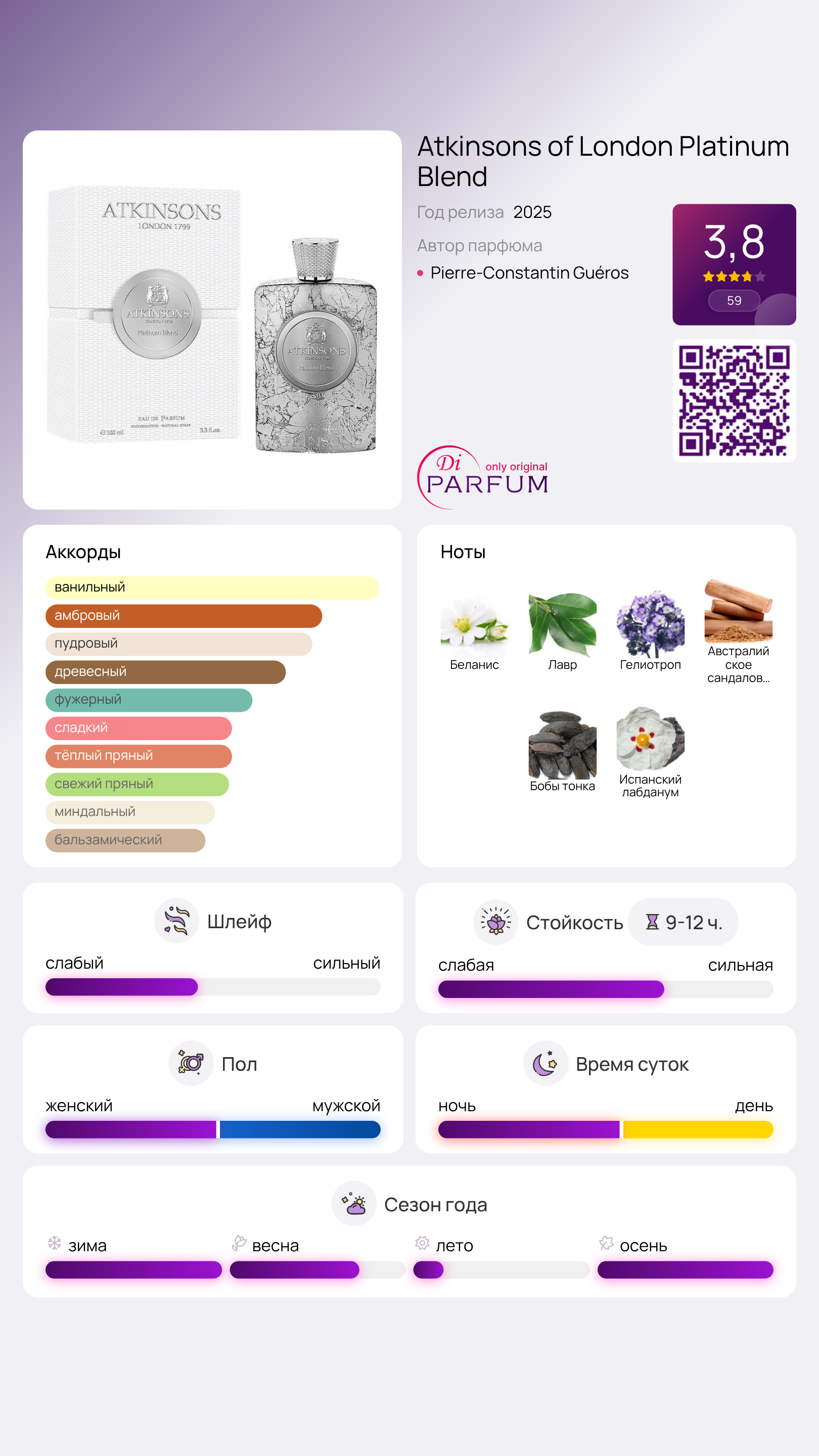 Platinum Blend от Atkinsons - это восточно-цветочный аромат для мужчин и женщин, который был представлен в 2025 году. За его создание отвечает парфюмер Pierre-Constantin Guéros, который мастерски сочетал различные компоненты для достижения уникального результата.