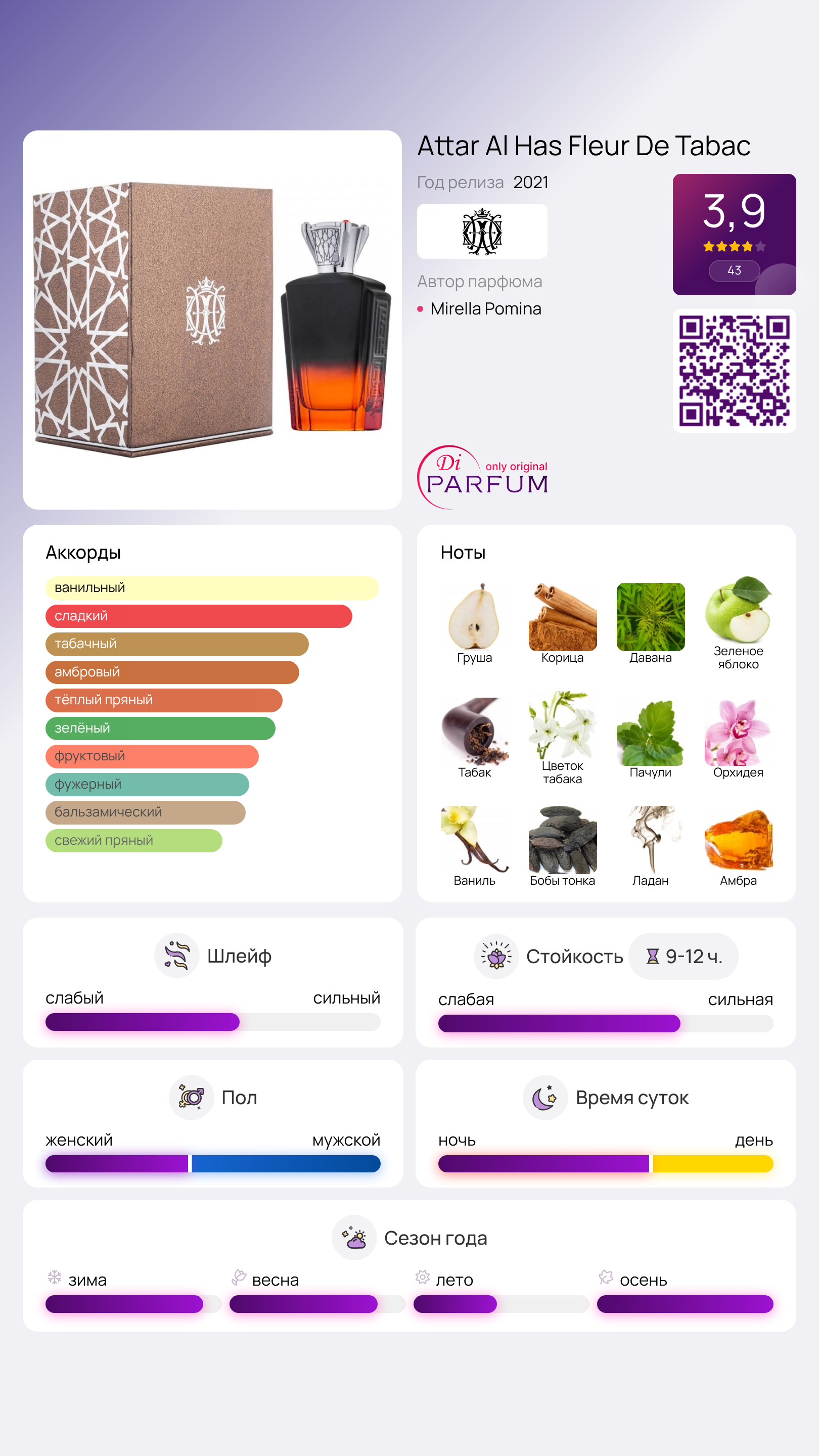 Завершает эту изысканную композицию классическая база, состоящая из манящей ванили, анималистичного белого мускуса, экзотических бобов тонка, божественной амбры и успокаивающего ладана. Fleur De Tabac от Attar Al Has – это великолепный восточный аромат, который обязательно станет звездой вашей коллекции парфюмов!
