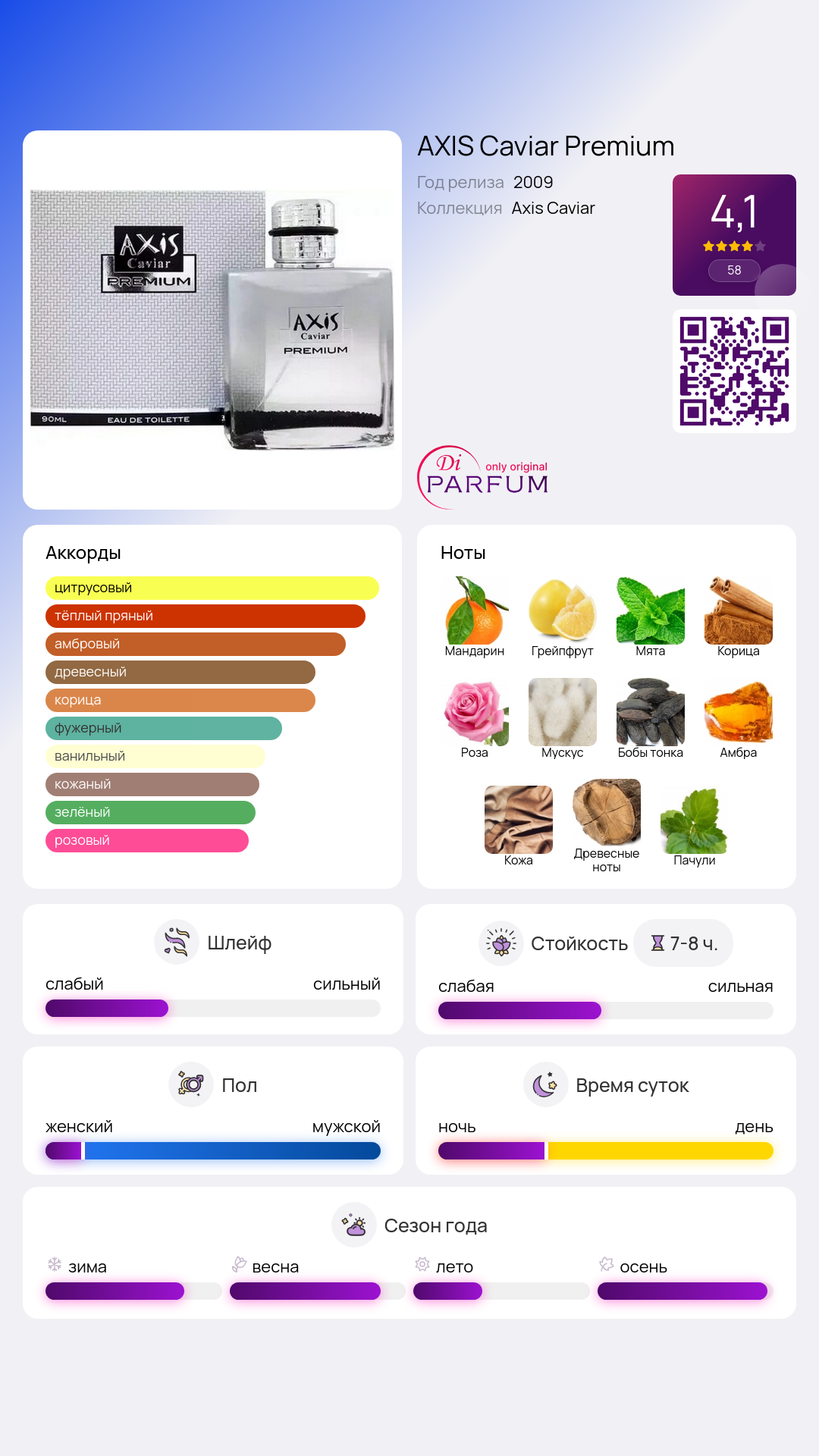 Axis Caviar Premium от Axis – это кожаный аромат для мужчин, который был запущен в 2009 году. Этот парфюм сочетает в себе чувственность и брутальность, создавая уникальный ароматный след. Первые ноты открываются ярким сочетанием мандарина, грейпфрута и мяты, создавая свежее, но смелое начало.