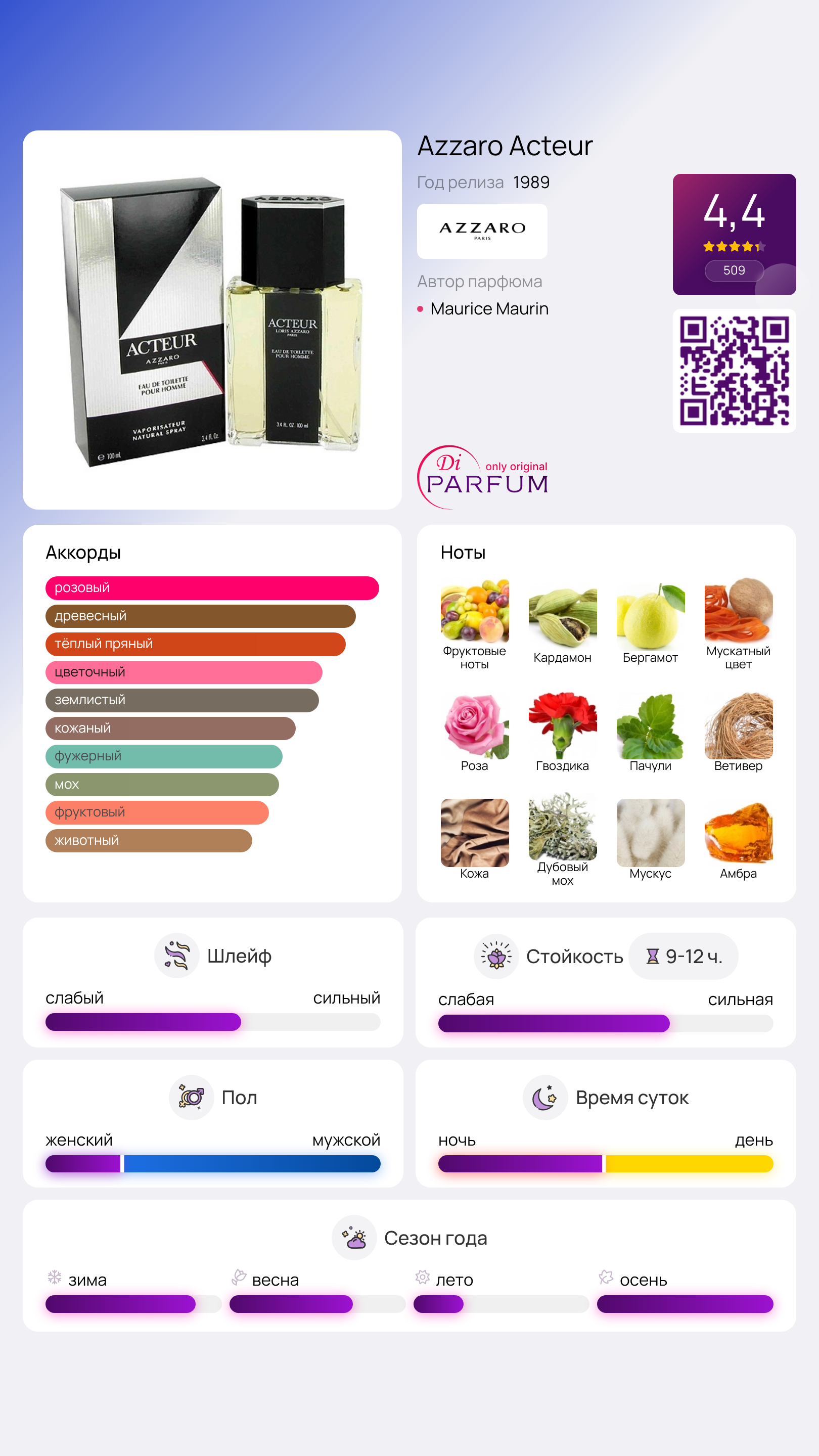 Аромат Acteur Azzaro, обладающий древесными и классическими нотами, создан для уверенных в себе и требовательных мужчин, стремящихся к достижению своих целей.