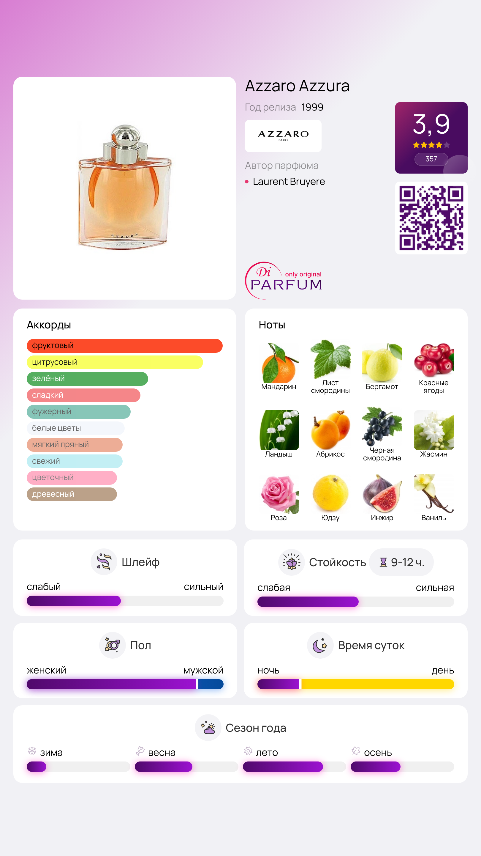 Парфюм Azzura от Loris Azzaro представляет собой яркую цветочно-фруктовую смесь, навеянную солнечными воспоминаниями о Средиземноморье. Элементы лазурного океана, свежие ароматы трав и цветов, а также горные нотки нашли свое отражение в этом удивительном флаконе с ароматной формулой.