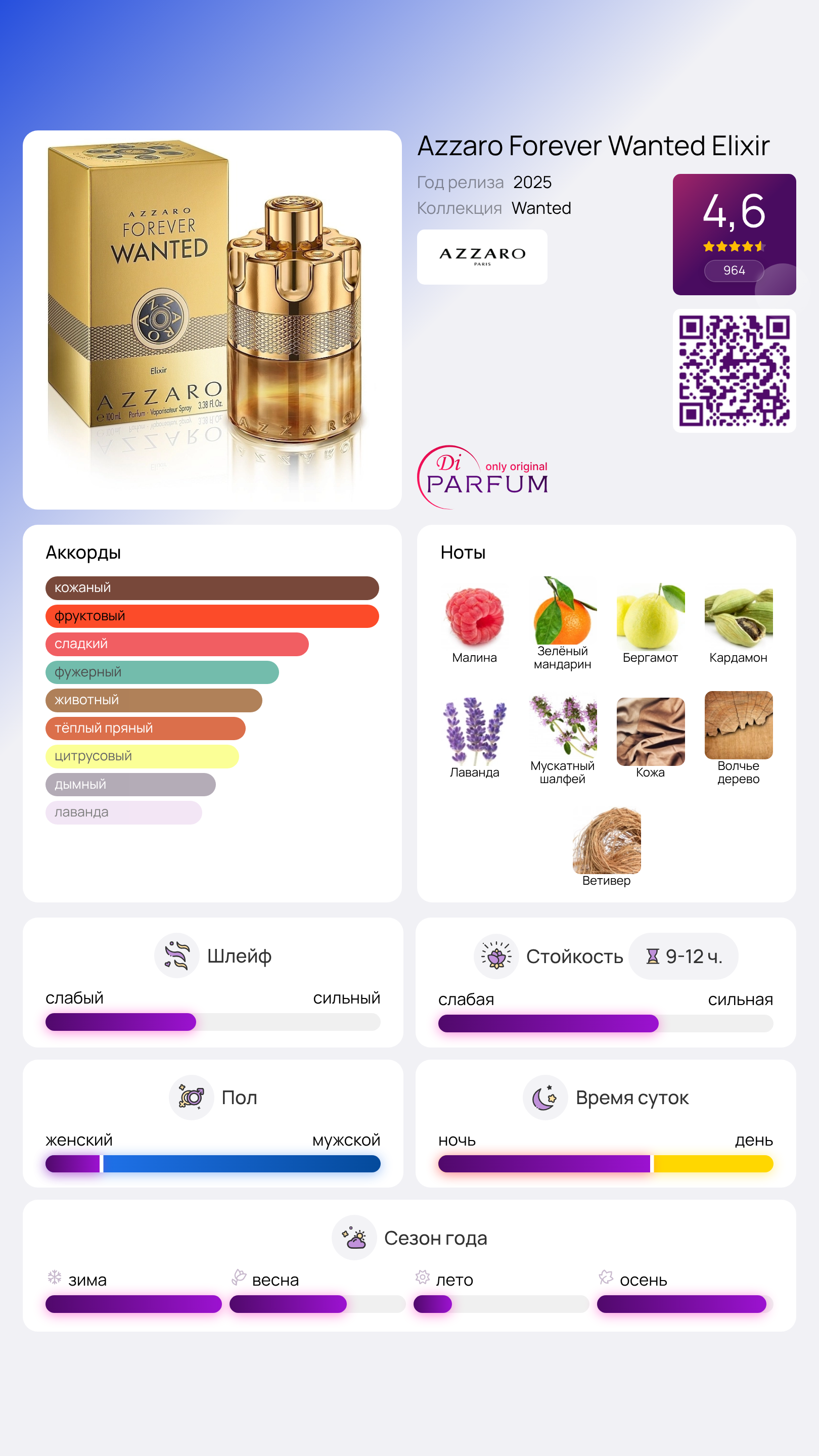 Финальные ноты кожи и ветивера добавляют чувственности и стойкости, оставляя за вами шлейф, который запомнится надолго. Этот парфюм идеально подойдет для стильных и уверенных в себе людей, стремящихся подчеркнуть свою индивидуальность.