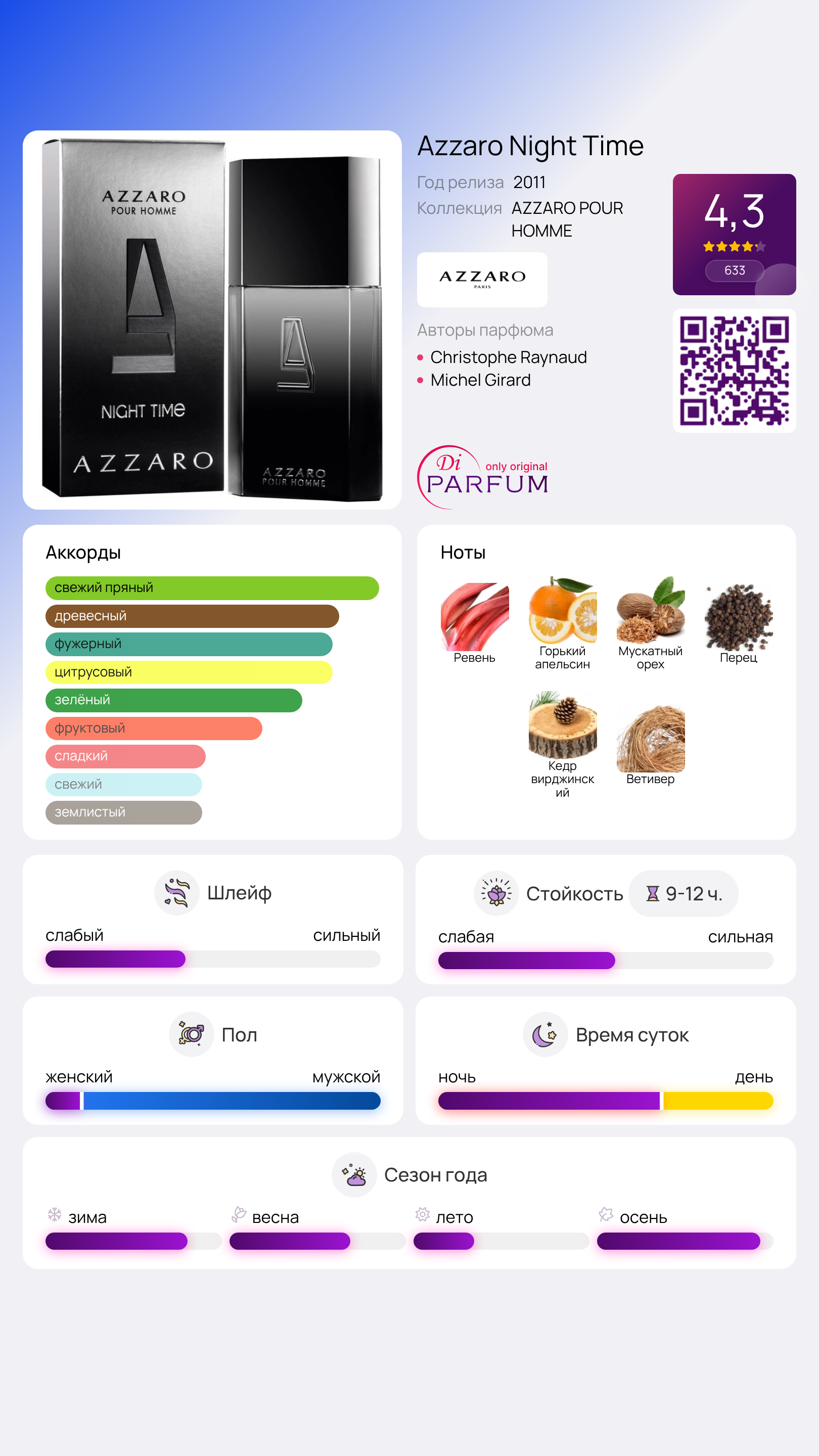 Этот парфюм относится к категориям фужерных ароматов, выделяясь своими мужественными и энергичными нотами. Если вы ищете аромат, который будет привлекать внимание и оставлять незабываемое впечатление, Azzaro Pour Homme Night Time станет отличным выбором для вас.