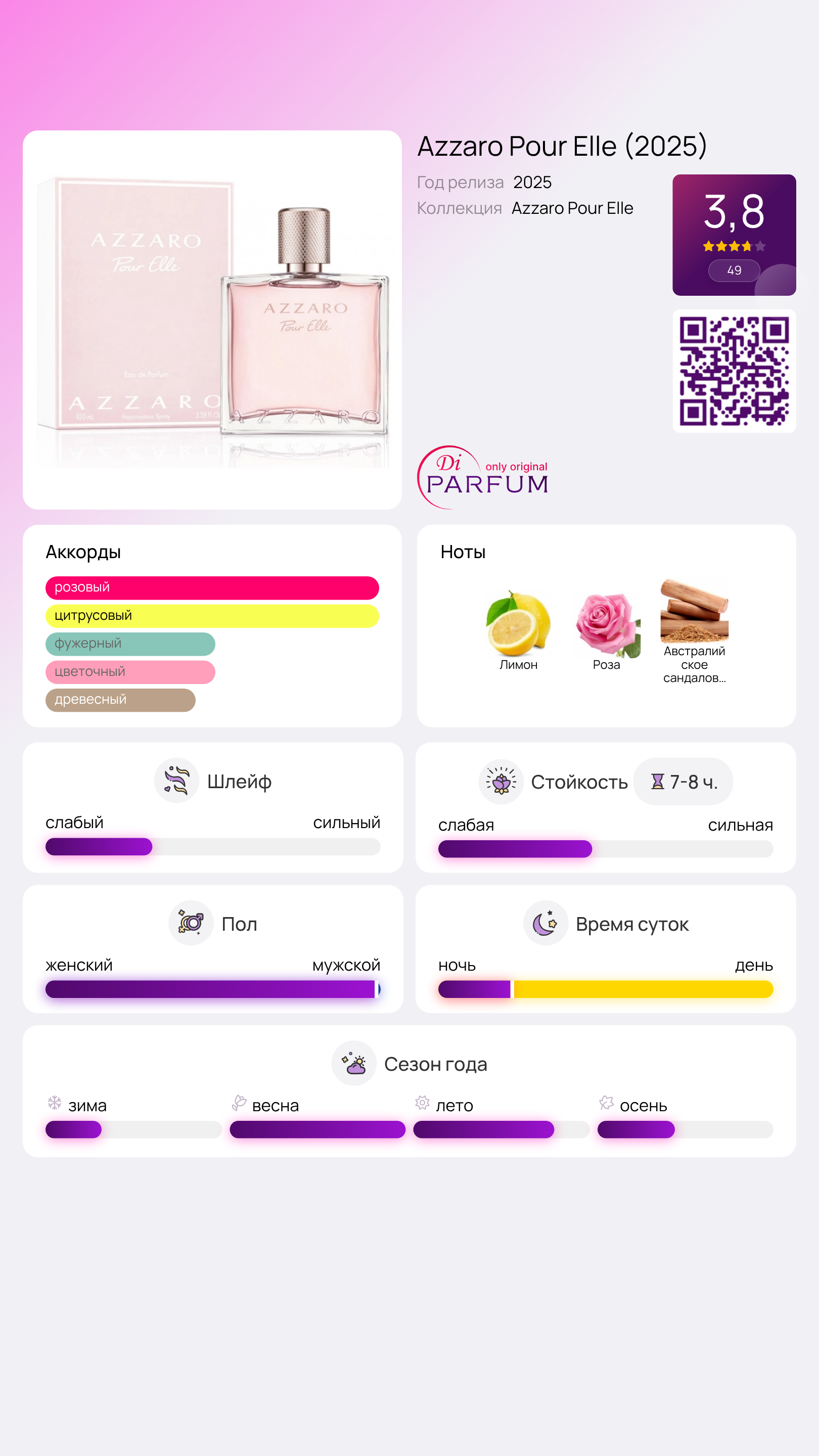 Состав аромата демонстрирует совершенство и утонченность, что делает Azzaro Pour Elle идеальным выбором как для повседневного использования, так и для особых случаев. Он отлично подчеркнет вашу индивидуальность и оставит незабываемое впечатление.