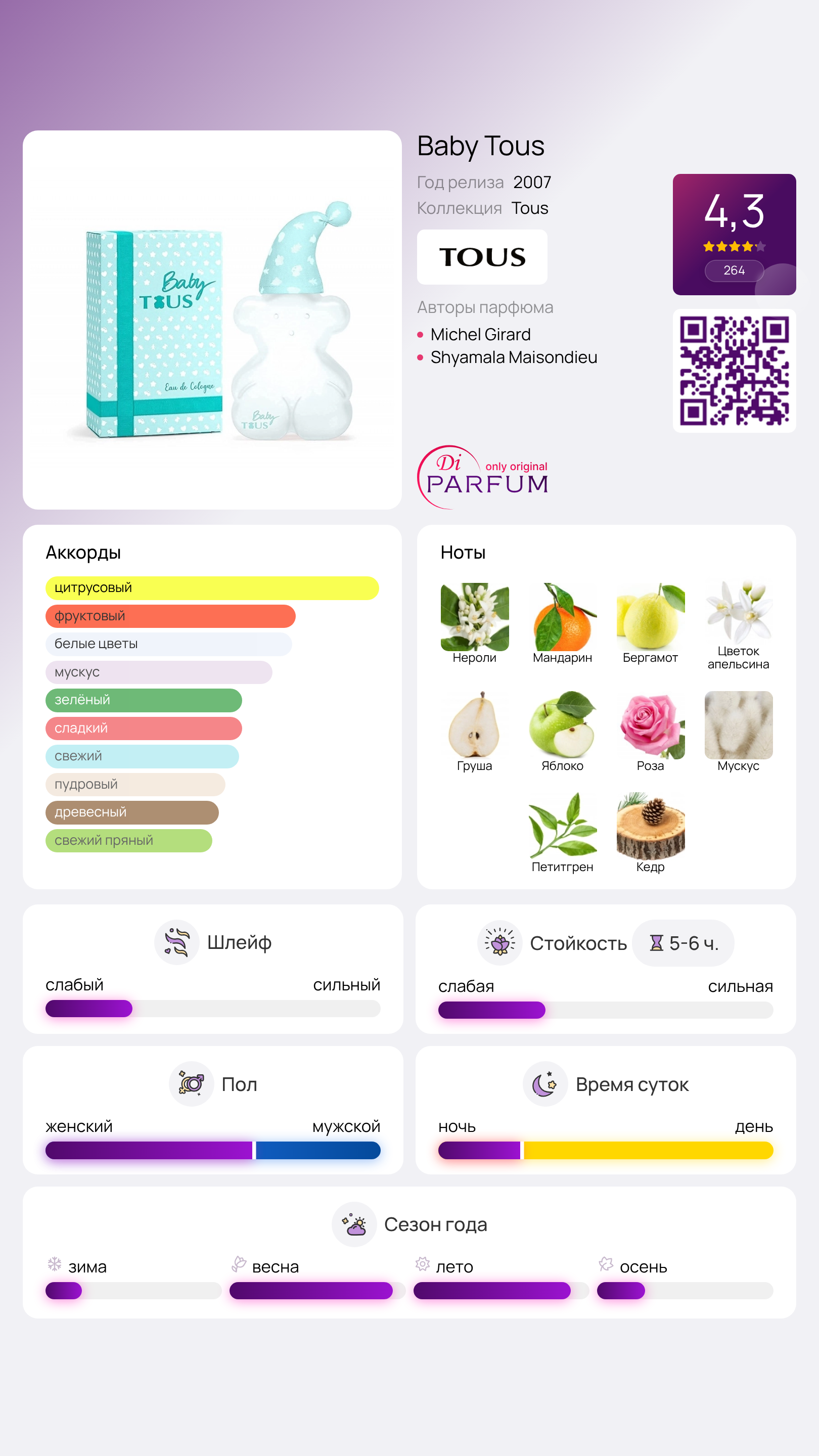 Аромат Tous Baby Tous вызывает привычные ассоциации с запахом ангелов или с новорожденными, чья кожа излучает истинную чистоту и невинность. Здесь речь идет не о физическом теле, а о душе - о ее искренности и чистоте. Если вы стремитесь избавиться от накопившейся моральной нагрузки, обязательно обратите внимание на эту оригинальную композицию, которая выделяется на фоне современных трендов.