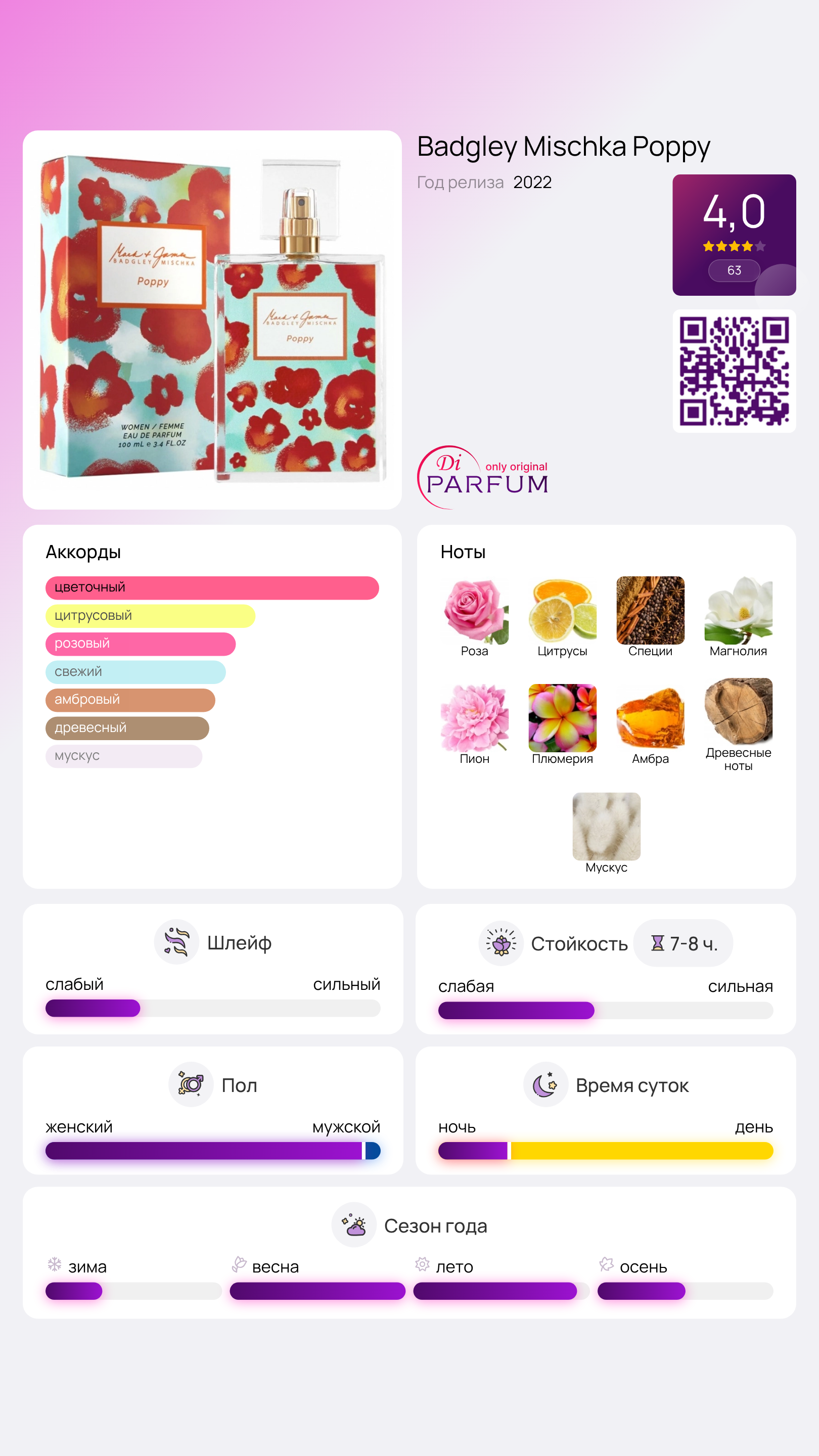 Poppy доступен в формате 100 мл Eau de Parfum, что делает его идеальным выбором для повседневного использования или особых случаев. Этот аромат прекрасно дополнит ваш образ, подчеркивая женственность и индивидуальность.