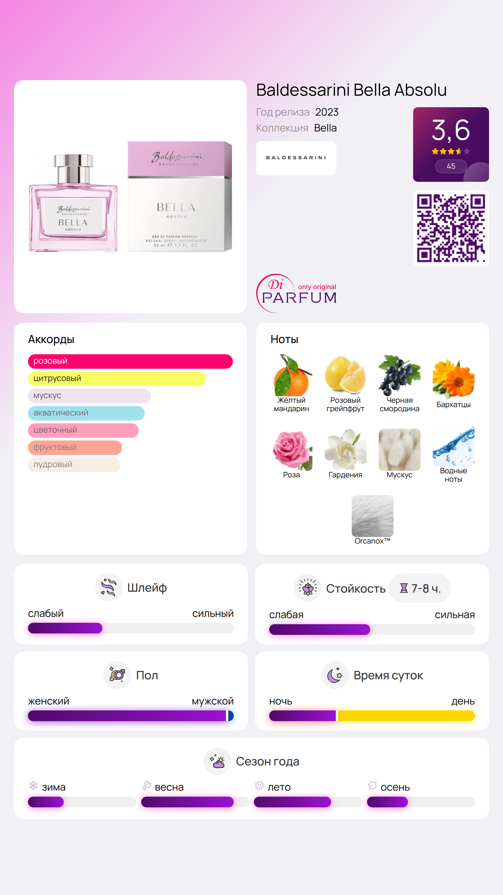 Обволакивающий шлейф отличается мускусной пудрой и амбровой молекулой orcanox, создавая утонченную композицию. Формула Baldessarini Bella Absolu от HUGO BOSS занимает особое место благодаря своему естественному звучанию и образу романтичной, но уверенной в себе женщины. Этот аромат ассоциируется с абсолютною Женственностью. Фланкер, который был создан на основе ранее выпущенного аромата Baldessarini Bella, был представлен культовым немецким брендом в 2023 году. Элегантно-розовый флакон выглядит очень стильно и презентабельно.