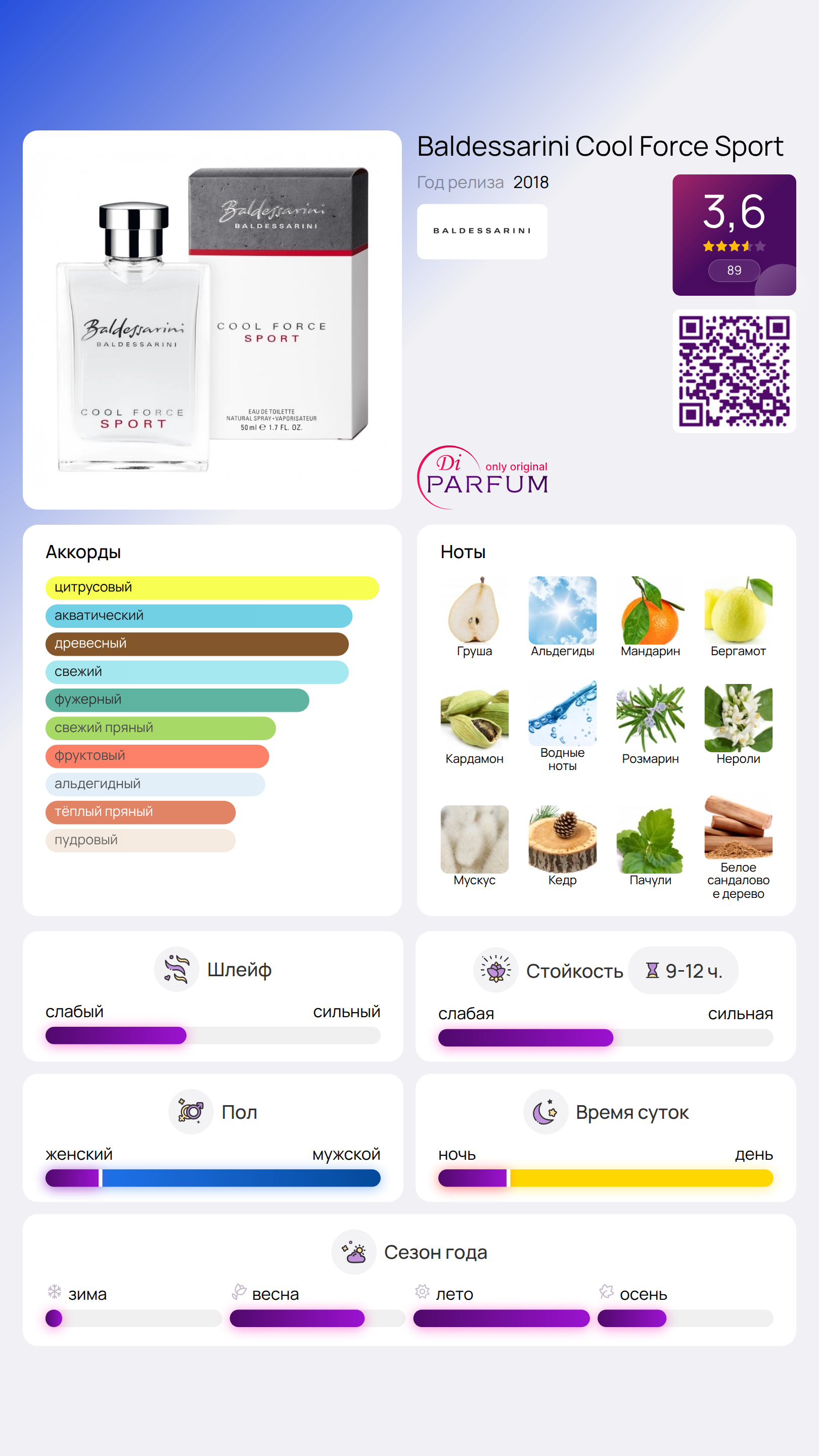 Парфюм Cool Force Sport представляет собой новую версию аромата Cool Force, отличающуюся большей энергией и динамичностью. Основная идея этого аромата - "Создан для мужчин, а не для мальчиков!"