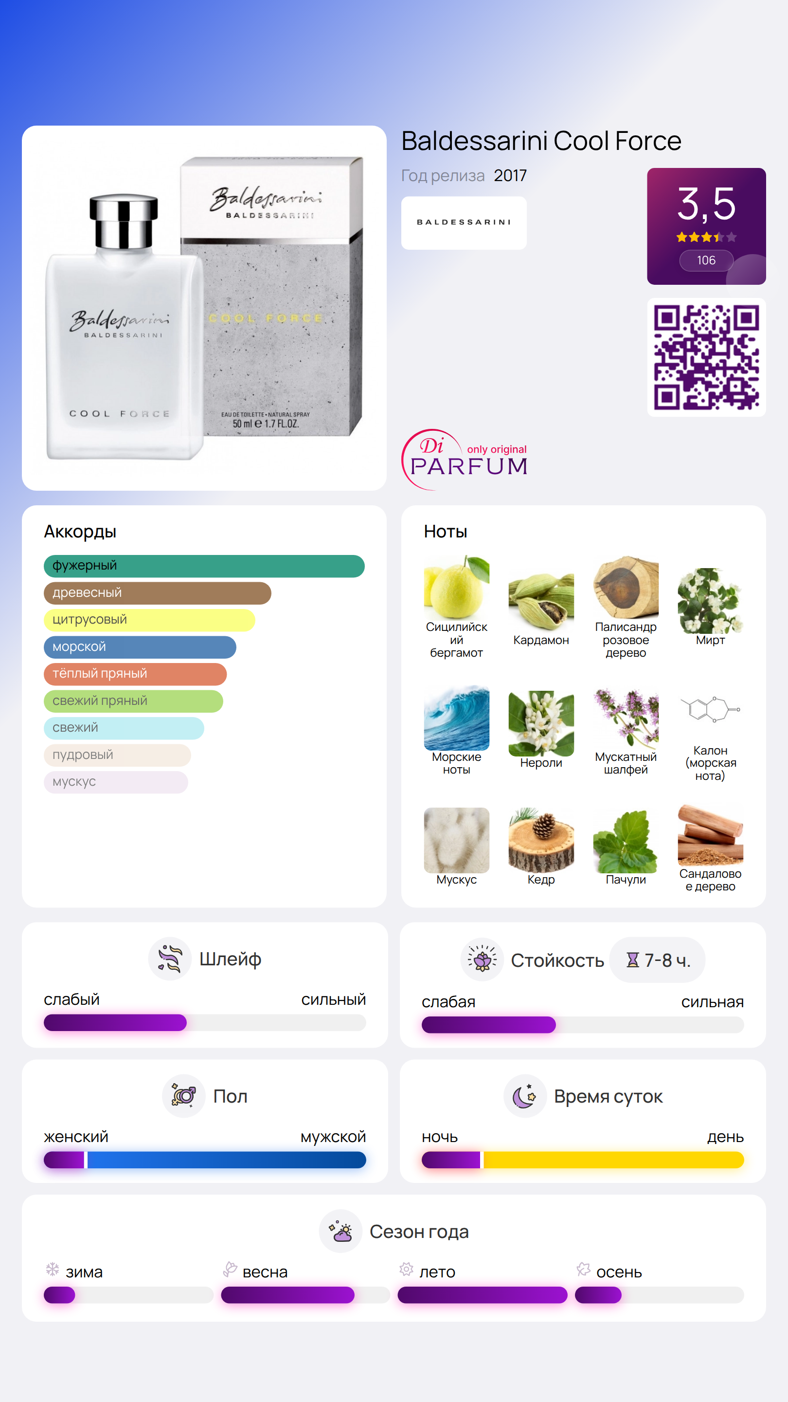 Каждому мужчине, который ценит древесные фужерные ароматы, стоит познакомиться с парфюмом Cool Force от Baldessarini. Этот запах был презентован в 2017 году. Автором композиции стал мастер Vincent Schaller, который создал теплую ауру, добавив в неё свежие акценты и легкие пряные ноты.