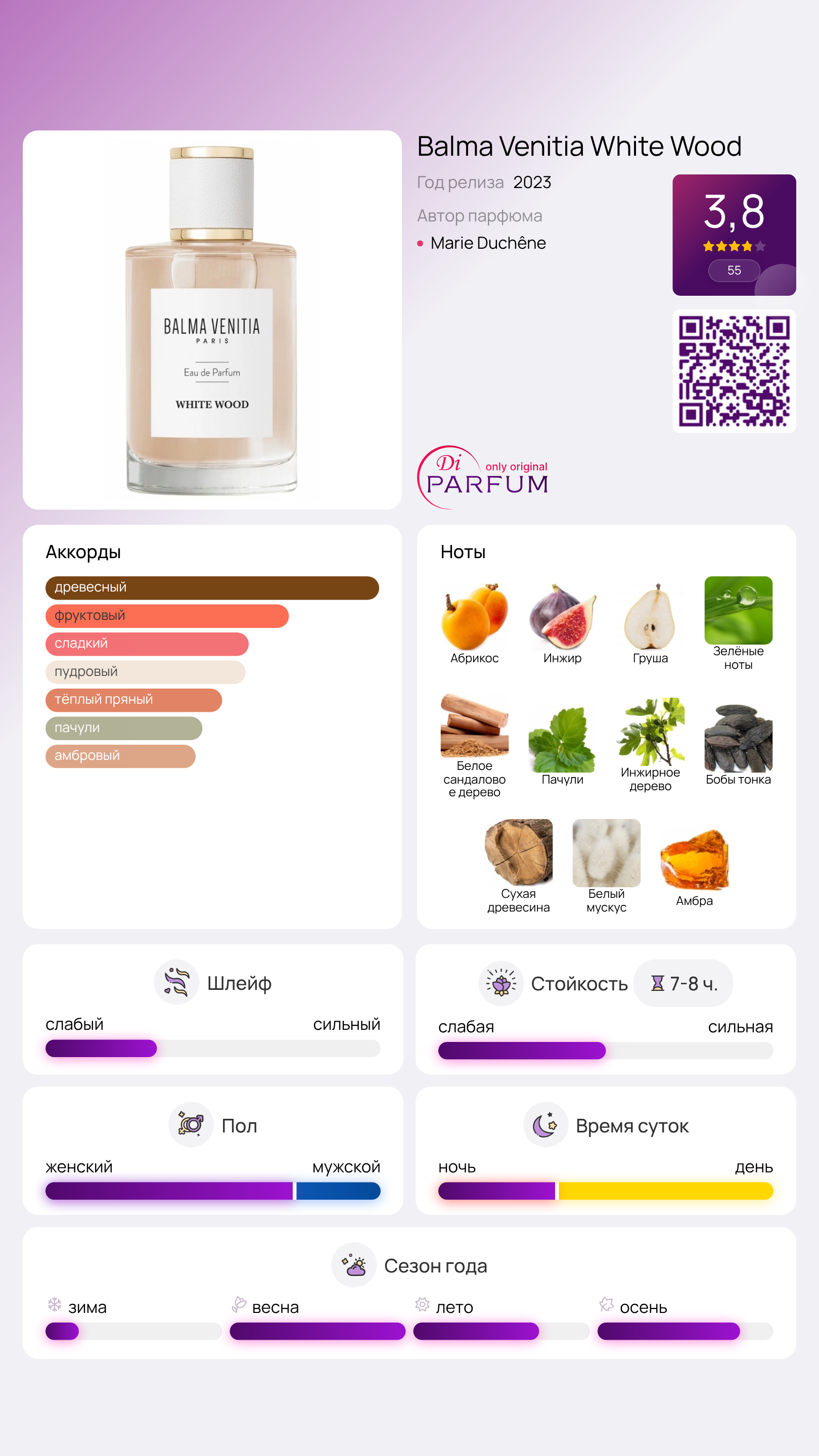 White Wood от Balma Venitia — это уникальный аромат, предназначенный как для женщин, так и для мужчин. Выпущенный в 2023 году, он быстро завоевал популярность благодаря своему необычному сочетанию нот. Композитор этого аромата — талантливый парфюмер Marie Duchêne.