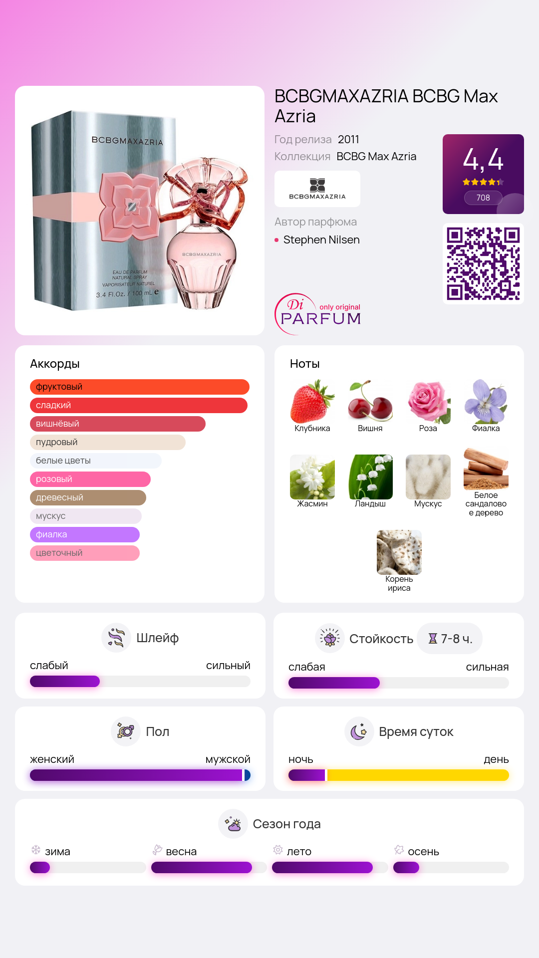 Американский модный дом BCBG Max Azria представляет свой новый парфюм под одноименным названием. В разработке аромата использовались душистые ноты из классической цветочно-фруктовой группы. Примечательно эксклюзивное оформление утонченного розового флакона – крышка в форме бабочки, которая плавно превращается в цветок, добавляет оригинальности и стиля.