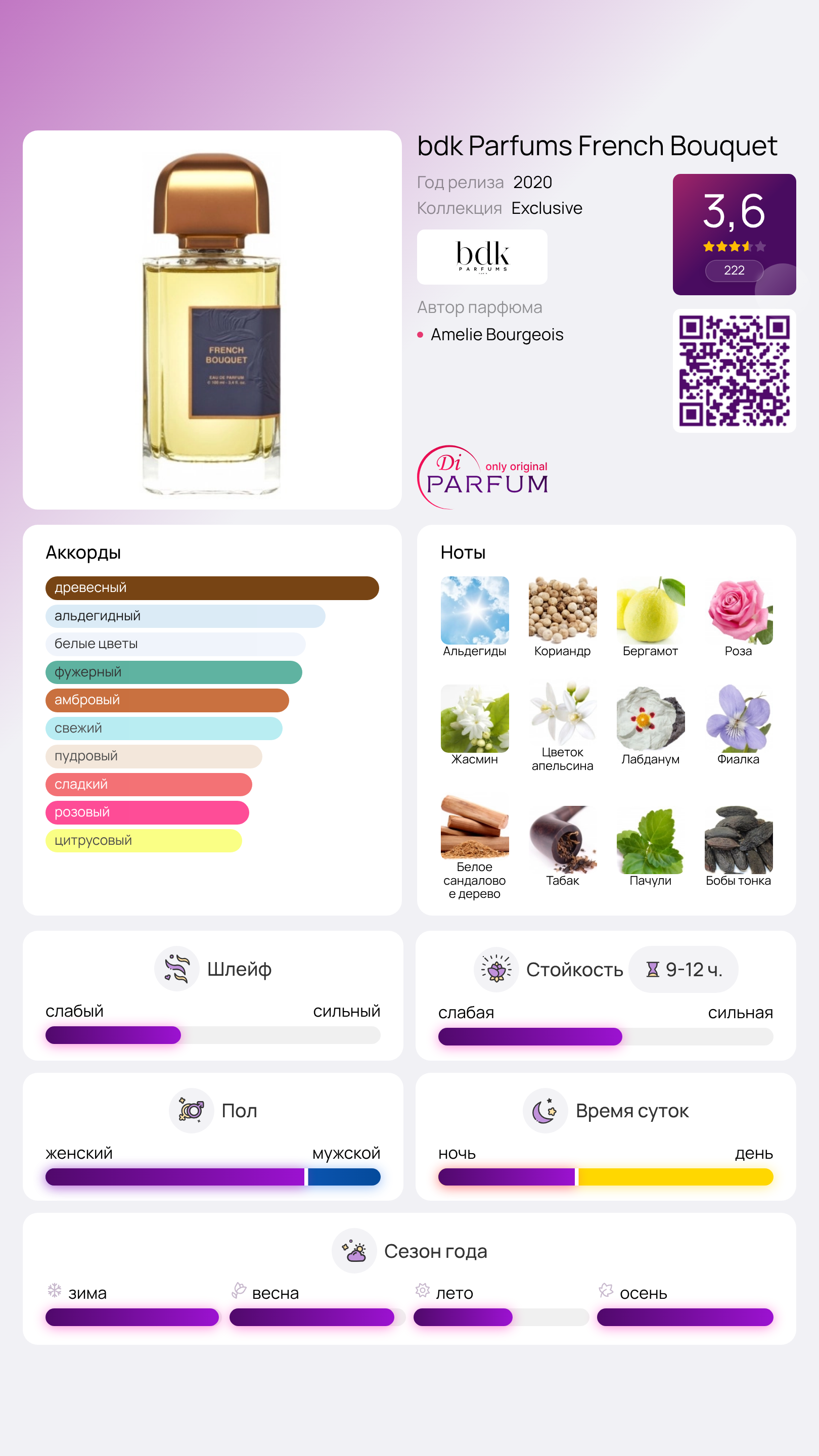 Ольфакторная пирамида French Bouquet от bdk Parfums начинается с пряной комбинации цитрусового бергамота и кориандра, которые гармонично сочетаются с изменчивыми альдегидными нюансами. В сердце аромата раскрывается волшебный сад, где переплетаются ноты нежного жасмина, чарующего сладкого апельсинового цвета и соблазнительной розы.