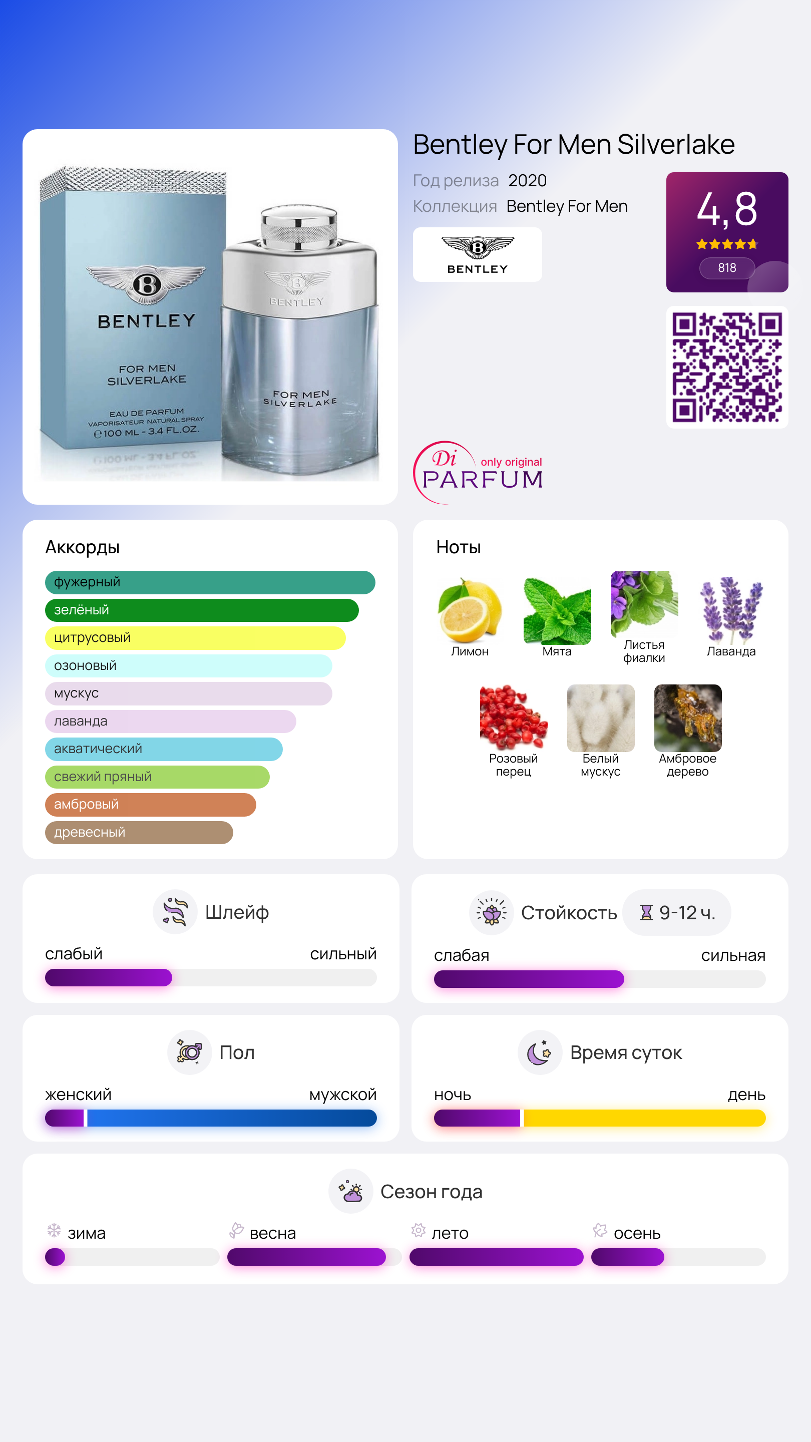 Не менее впечатляющие, чем мощные модели этого автомобильного бренда, ароматы, предназначенные для женщин. Парфюм Bentley For Men Silverlake представляет собой новейший стандарт мужественности и красоты, выпущенный в 2022 году. Флакон выполнен в металлических и серебристых оттенках, что полностью соответствует его названию. Дизайн продуман до мелочей, как двигатель роскошного кабриолета Bacalar, а фирменный выгравированный логотип стал важным элементом каждого флакона этой коллекции.