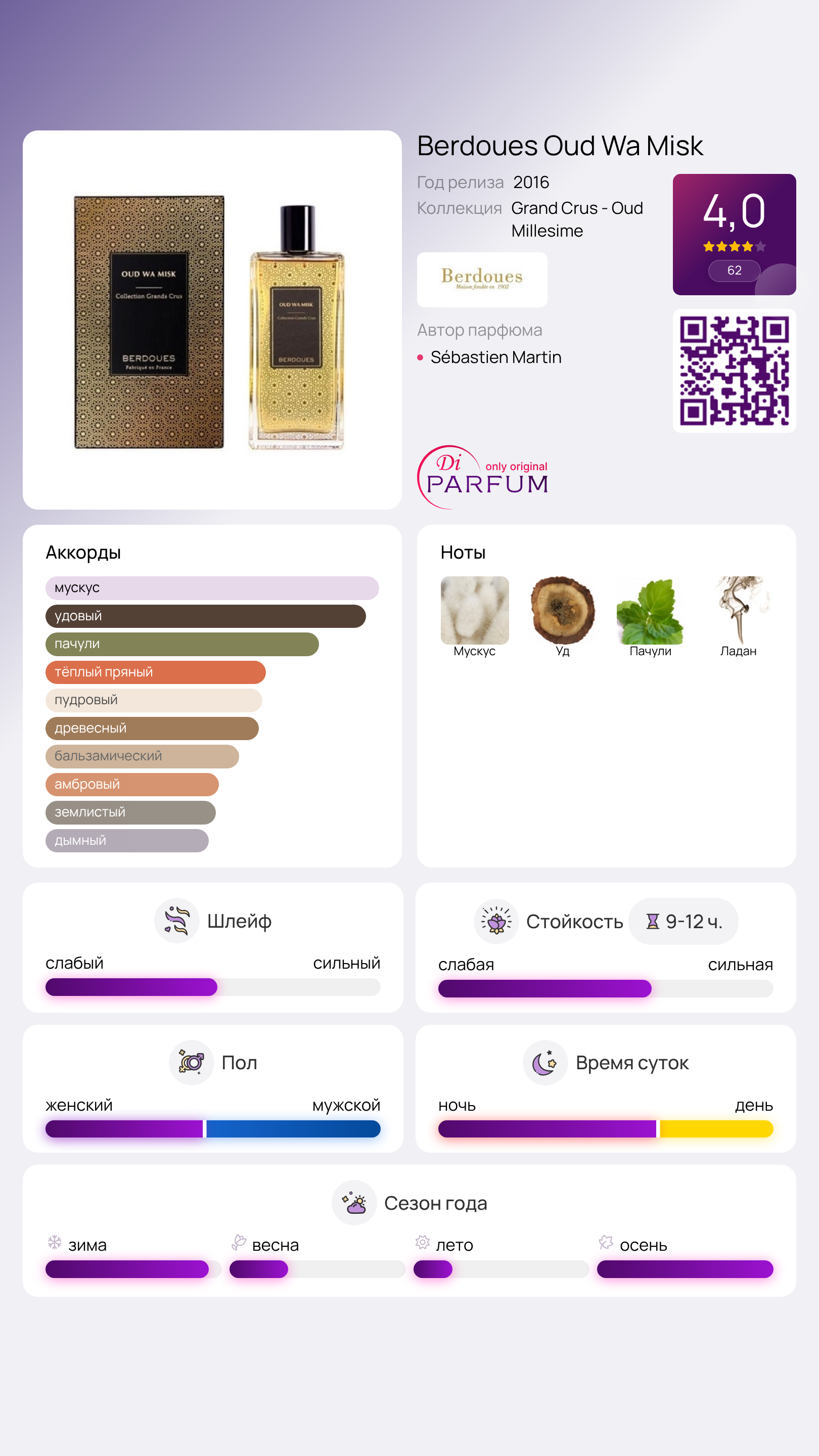 Данный парфюмерный шедевр от французского бренда способен привлечь интерес как мужчин, так и женщин. Глубокая композиция Oud Wa Misk была выпущена в 2016 году в рамках роскошной коллекции Collection Grands Crus, где ароматы сочетает богатое разнообразие нюансов агарового дерева. Создатели парфюмерии старались продемонстрировать, как Уд (черное золото восточной парфюмерии) может раскрывать свои грани по-разному в зависимости от состава. Эта парфюмерная вода пронизана таинственной атмосферой Востока.