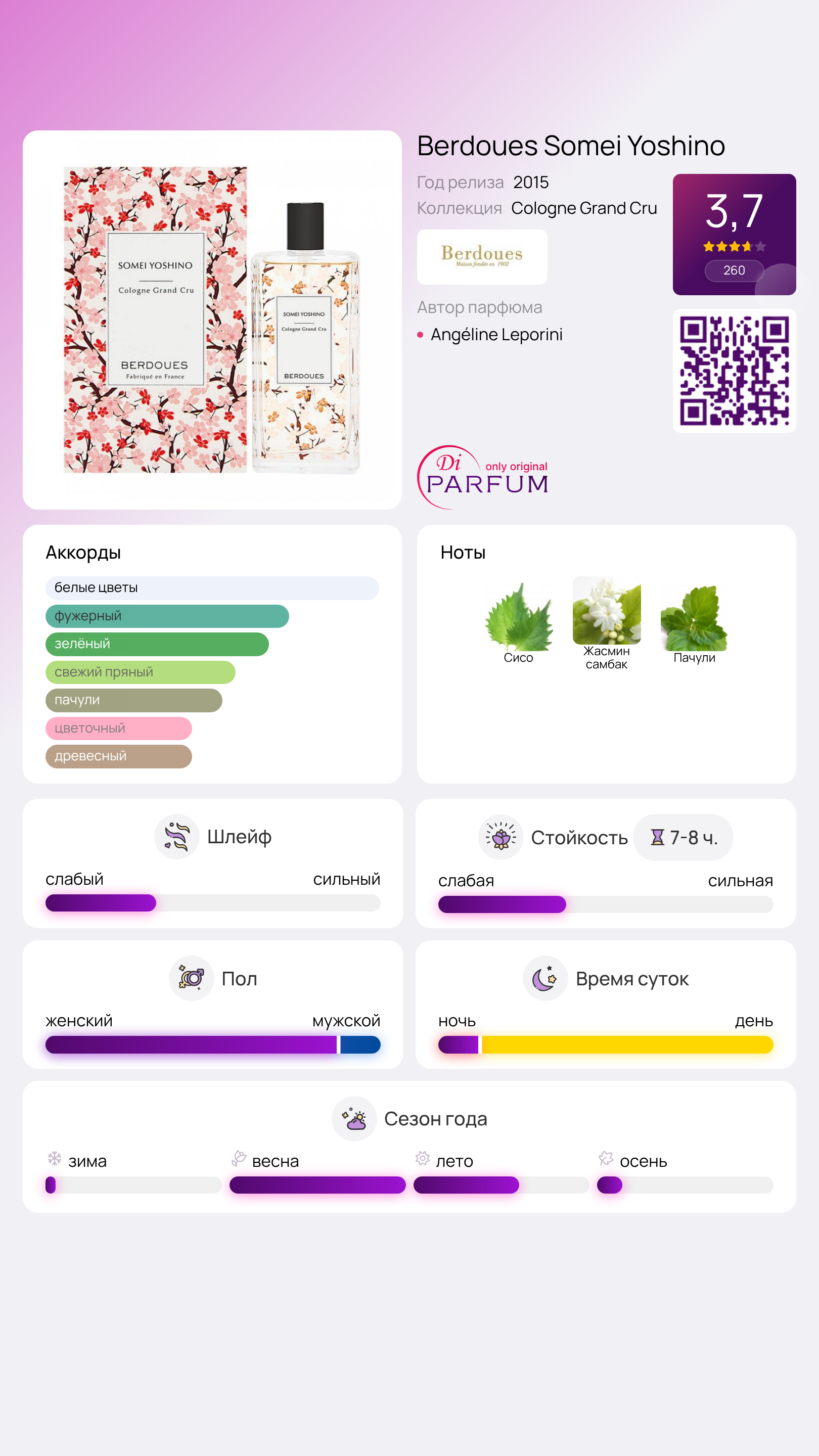 В шелковистом шлейфе скрывается пряный оттенок индонезийских пачулей. Нежная композиция Somei Yoshino от Berdoues — это настоящая обонятельная симфония, олицетворяющая цветение. Такой чарующий аромат привлекает семьи к садам, где они могут насладиться волшебством сакуры. Парфюмерная вода была выпущена французским брендом в 2015 году, а лаконичный флакон украшен нежно-розовыми соцветиями сакуры.