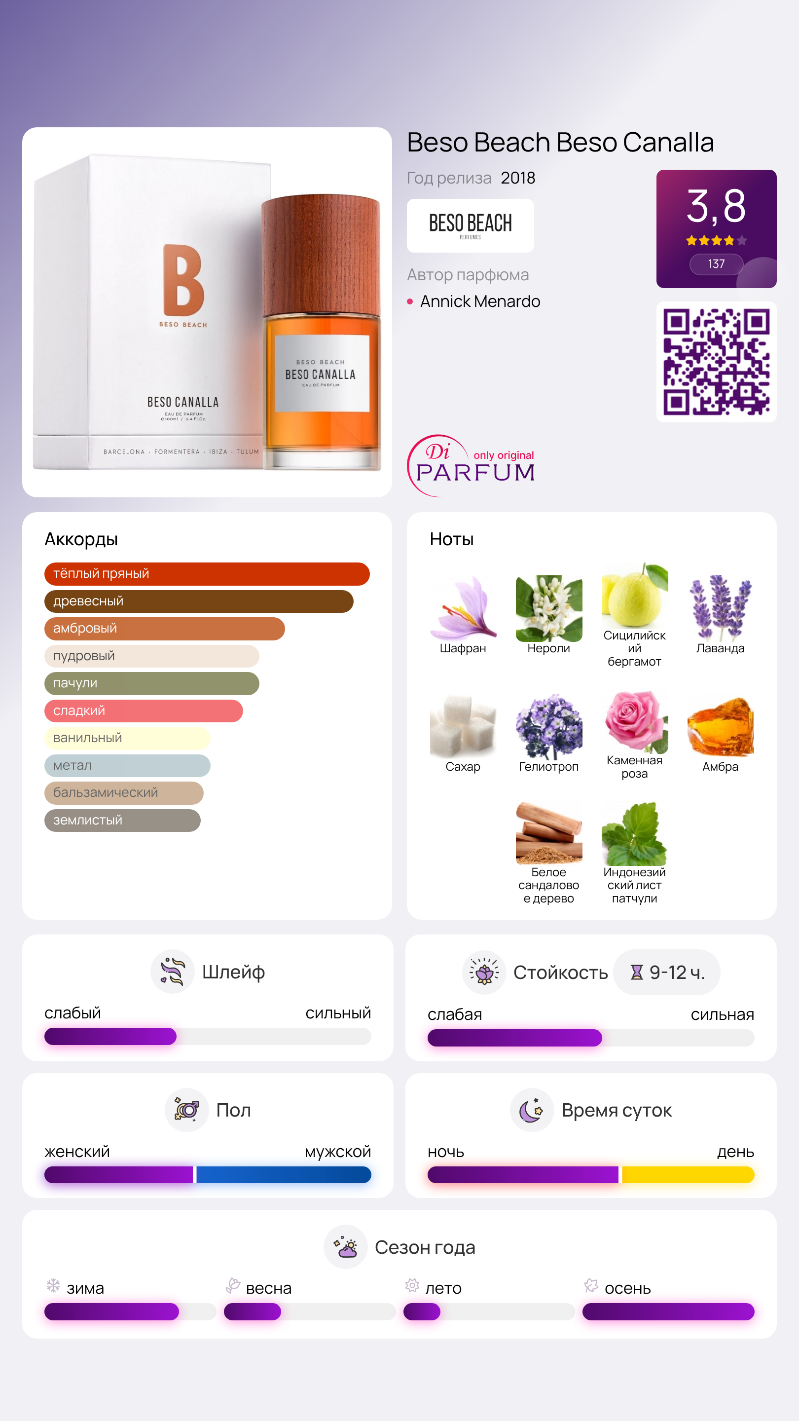 Композиция Beso Canalla от Beso Beach удивляет своей страстью и энергетикой, подчеркивая изысканность своего обладателя, будь то мужчина или женщина. Этот уникальный аромат позволяет каждому найти в нем что-то свое, нечто искреннее и личное.