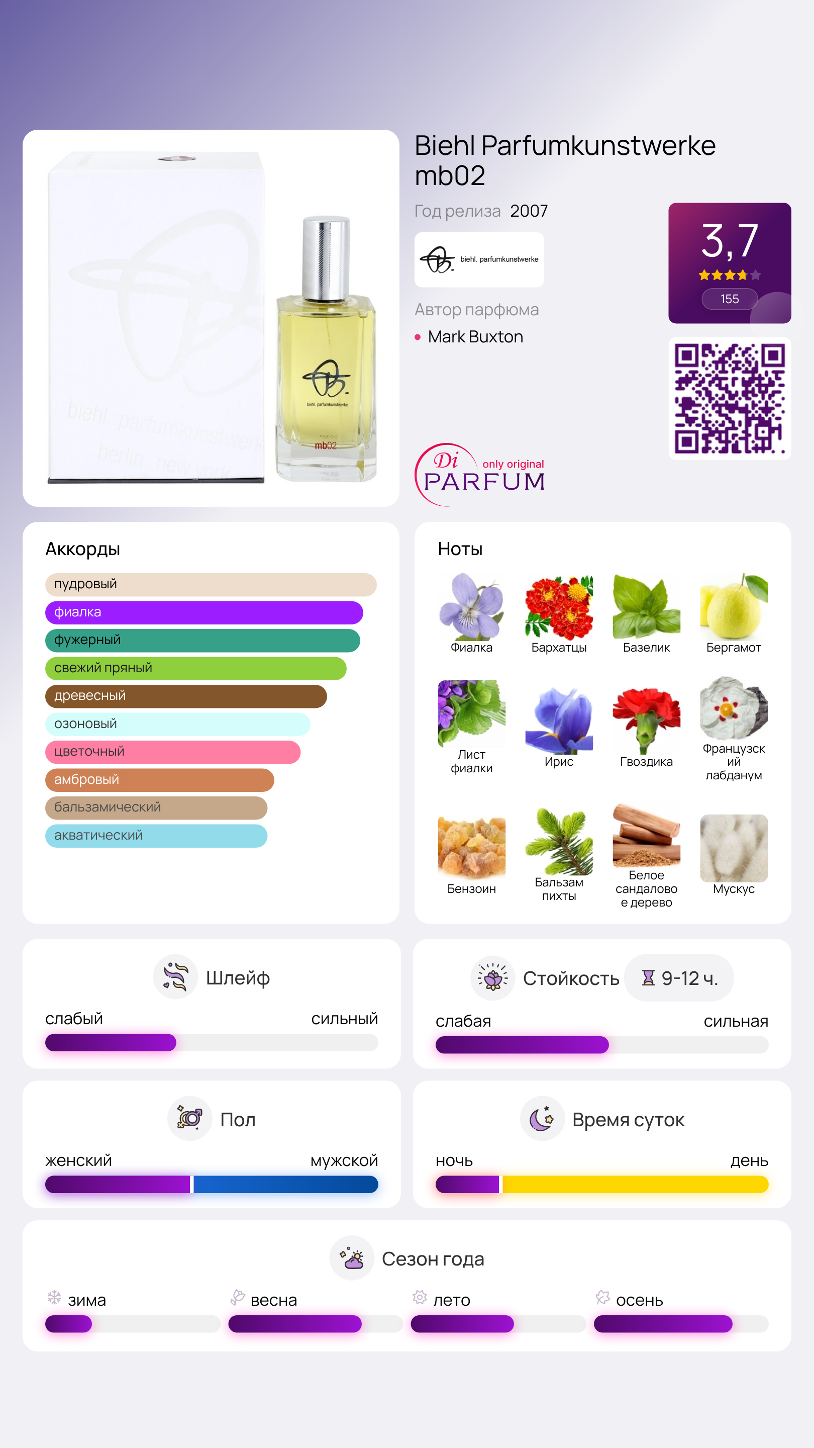 mb02 от biehl parfumkunstwerke — это шипровый аромат для женщин и мужчин, увидевший свет в 2007 году. Создателем данной композиции является известный парфюмер Mark Buxton. В верхних нотах скрываются фиалка, бархатцы, базилик и бергамот. Сердце аромата наполнено нотами фиалкового листа, ириса, гвоздики и французского лабданума, в то время как базовые ноты представлены изысканным сочетанием бензоина, бальзамового ели, сандалового дерева и мускуса.