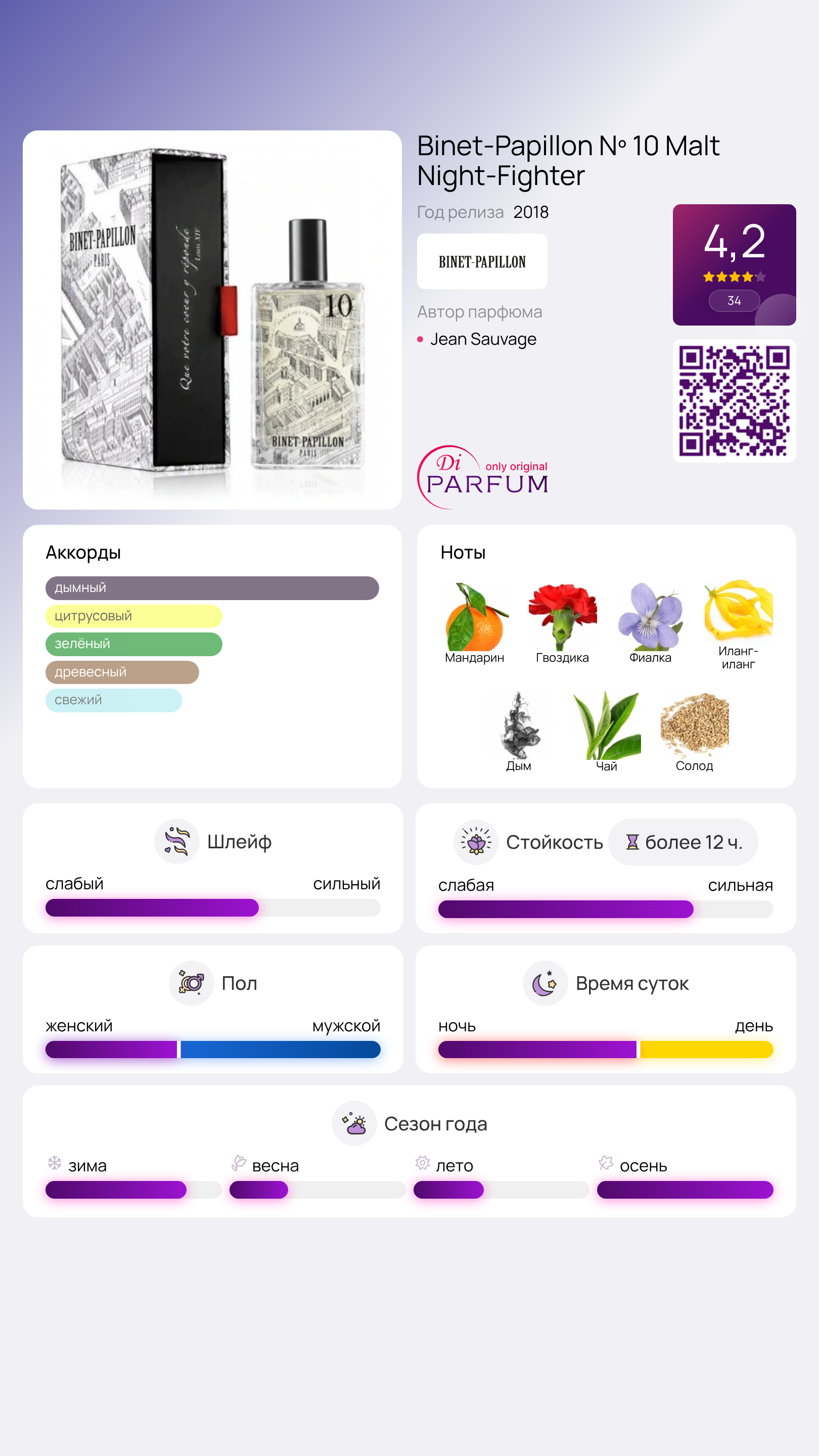 Дизайн флакона включает элементы шелкографии, придавая ему оригинальность. Уникальная формула Nº 10 Malt Night-Fighter от Binet-Papillon вызывает ощущение близости и тепла. Это не просто парфюмерия, а эмоции, в которые хочется погрузиться с головой. Аромат был представлен в 2018 году в коллекции Classic Eaux De Parfum. Он входит в серию пронумерованных композиций, каждая из которых посвящена знаковым ингредиентам. Этот французский бренд славится натуральными формулами, состоящими на 84% из органического сырья.