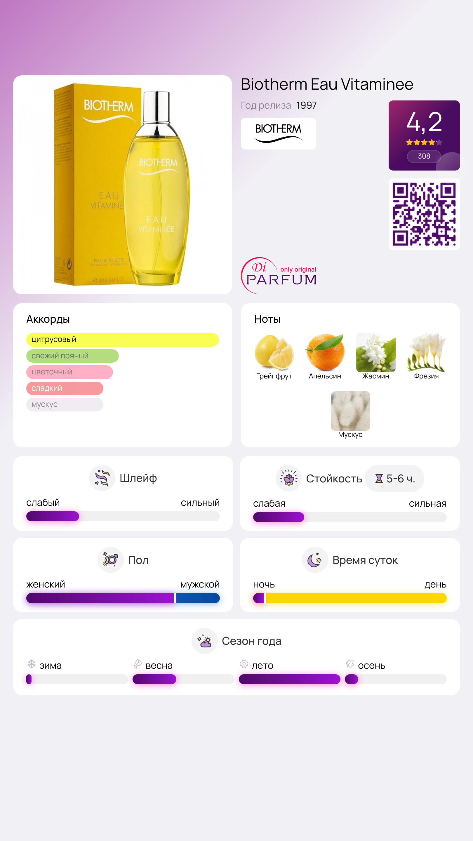 В 1950 году началось производство косметики, в состав которой входила эта ценная субстанция, и компания приняла название Biotherm. Создание парфюмерной линии состоялось позже, однако основной принцип компании оставался неизменным: использование исключительно натуральных компонентов и высокое качество продукции. Eau Vitaminee от Biotherm был разработан как источником энергии и свежести, предлагая обзорный коктейль для поднятия настроения на каждый день.