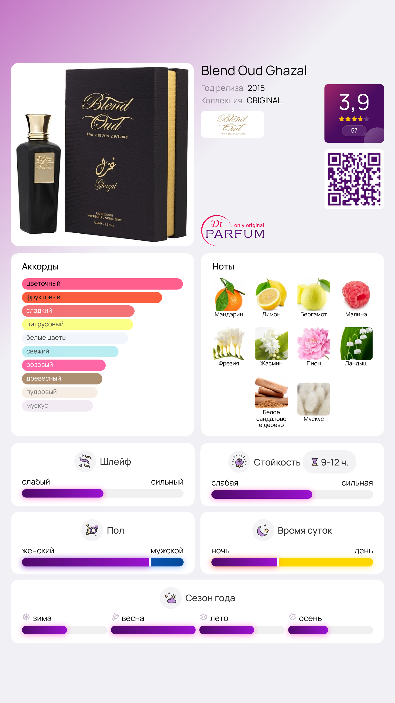 Шлейф парфюма раскрывается классическим ориентальным аккордом, где древесные и дымчатые ноты сандала переплетаются с бархатистым мускусом. В жару аромат Ghazal от Blend Oud на коже проявляет легкие аквальные оттенки, даря ощущение воздушности и безмятежности. Это тихий и ненавязчивый аромат, который превосходно подходит для повседневного использования.