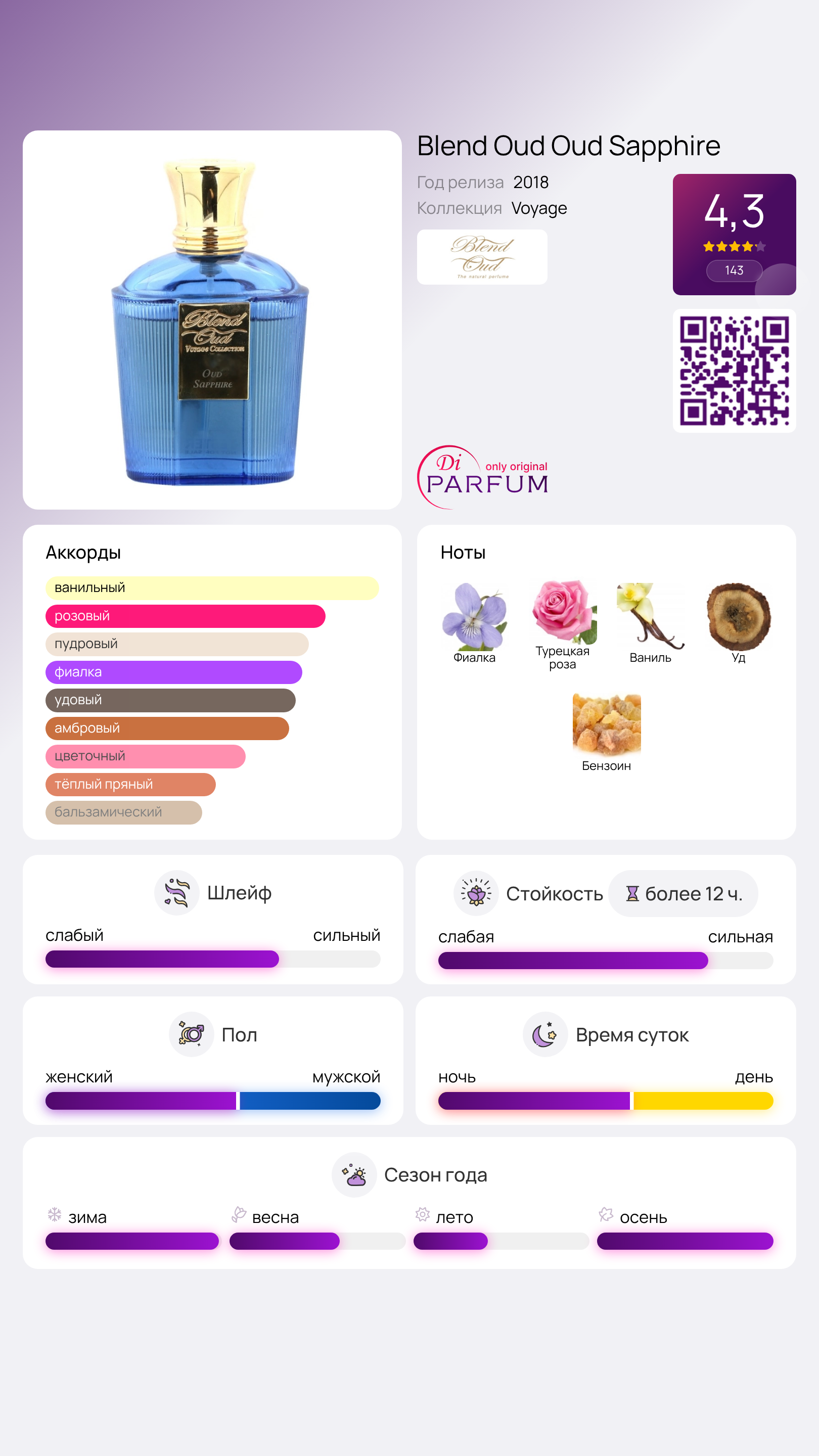 Завораживающий дымный шлейф из уда усиливает впечатление от этого волшебного букета. Его дополняет соблазнительная ваниль, основной поставщик которой – Мадагаскар, органично сочетающаяся со смолистым бензоином. Бархатная композиция Oud Sapphire от Blend Oud представляет собой поэтическое выражение любви к цветам и ласкающему ветру, отражая светлые чувства.