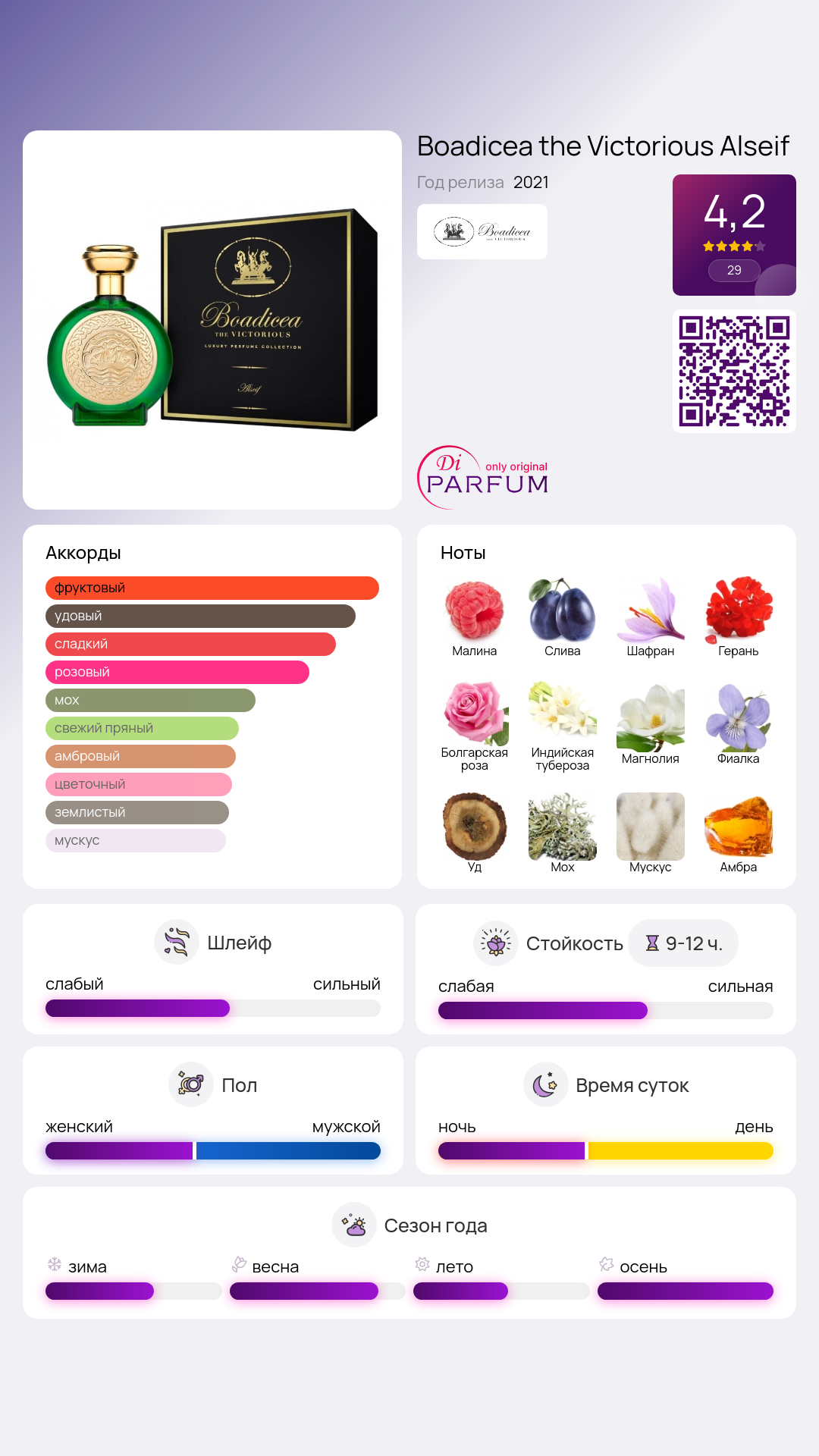 Нежная, глубокая база на основе уда приглашает в свой плен, гипнотизируя шоколадной дымной гурманикой тонка и легкой пряностью вали, расположенной на мшистом бархатном покрове. Анималистические ноты амбры и мускуса завершает композицию Boadicea the Victorious Alseif, забирая с собой ваше сердце и душу.