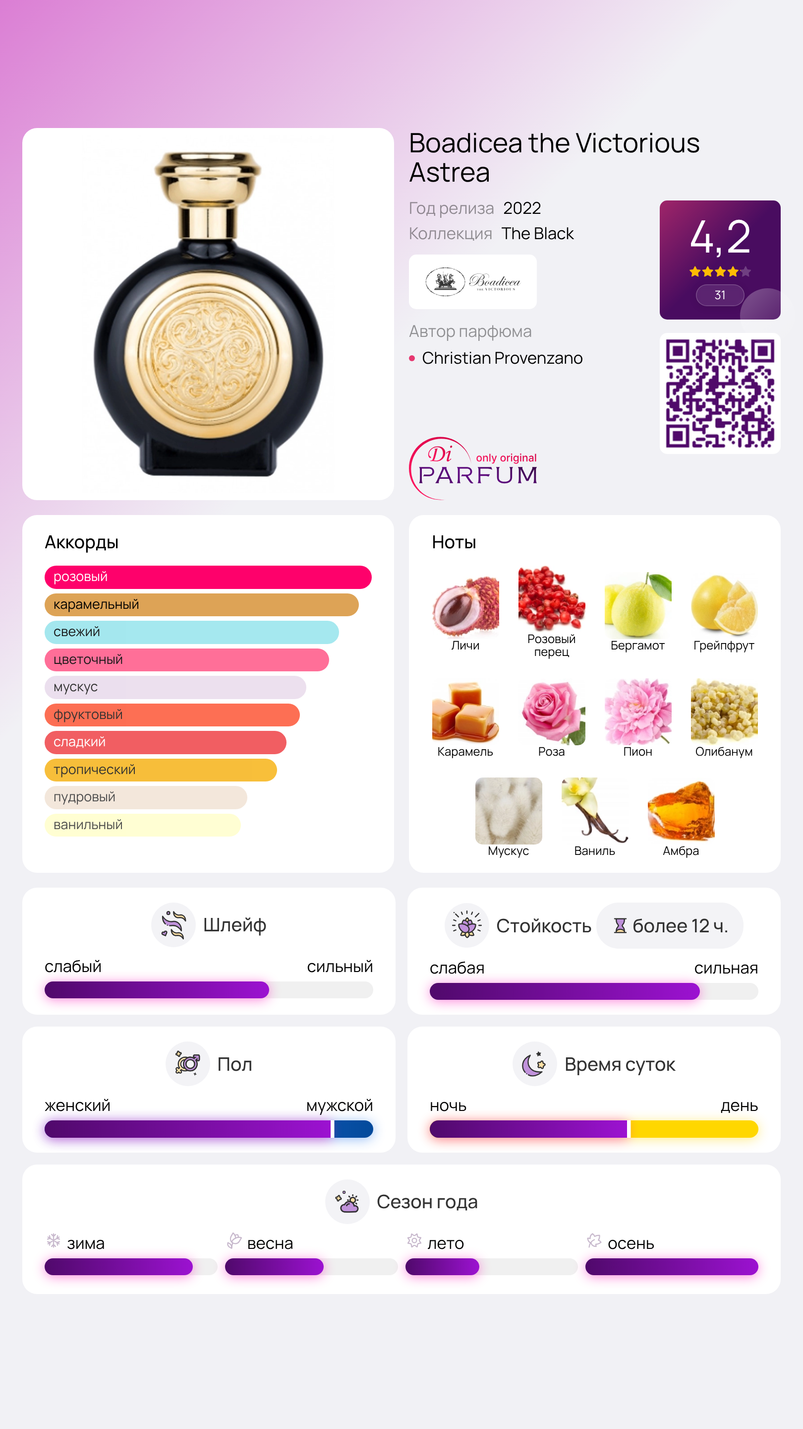 Шлейф аромата изыскан и наполнен тонкими нотами ванильного олибанума и нежного мускуса, создавая тёплую и умиротворяющую базу, как вечерняя забота. В пресс-релизе упоминается, что фирменный флакон, украшенный серебристым щитом, символизирует чистоту, мудрость, благородство и оптимизм. В 2022 году этот обворожительный аромат Astrea от Boadicea The Victorious был представлен эксклюзивно для российской аудитории.