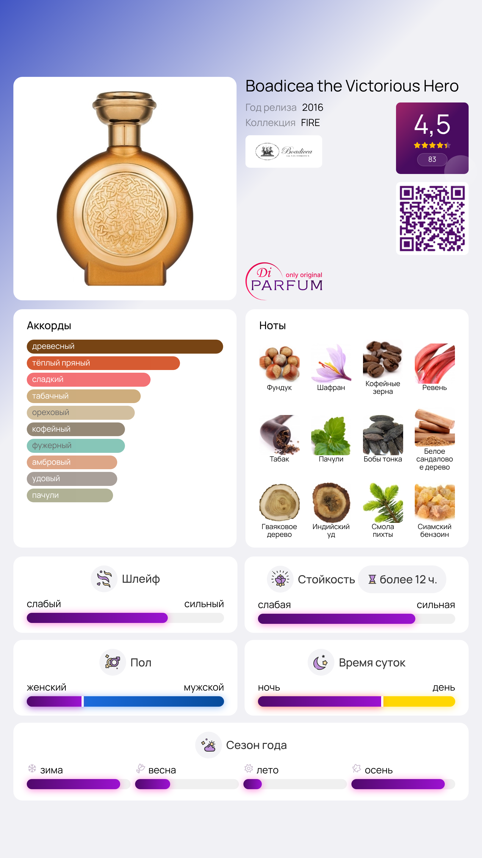 Аромат Boadicea the Victorious Hero воплощает собой дух королевы Боадицеи, сочетая в себе мужественность и женскую чувственность. Это уникальное произведение парфюмерии объединяет необычные ингредиенты, которая передает силу и доблесть правительницы.