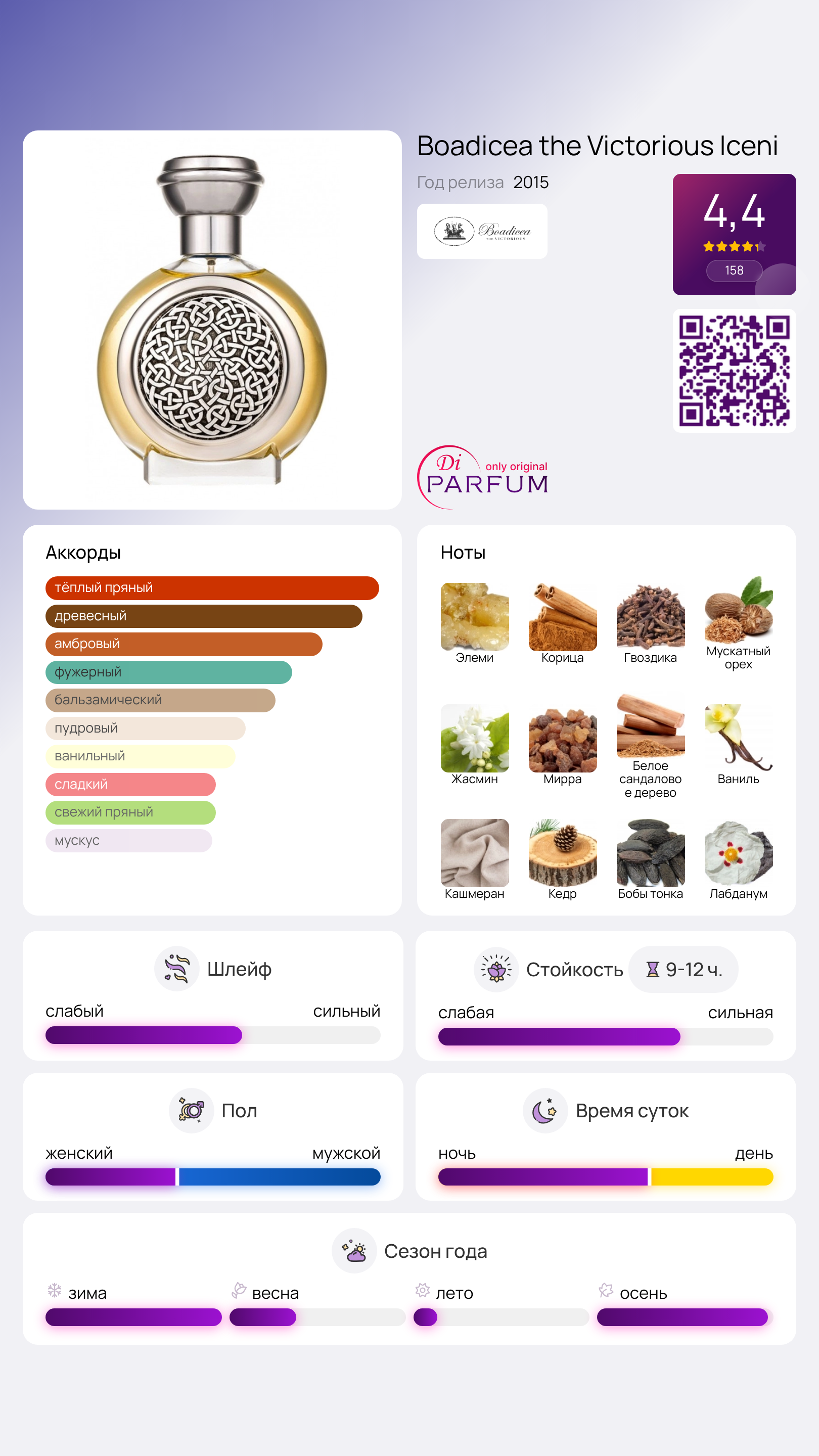 Восточный парфюм Boadicea The Victorious Iceni был представлен в 2015 году в комплекте с ароматом Torc. Эти ароматы стали символами традиций и величия племени иценов, которое возглавляло королева Бодеция. В итоге они стали важной частью британской культуры. Как воины сражались против угнетения, этот парфюм олицетворяет идеи бунта и стремления к свободе.