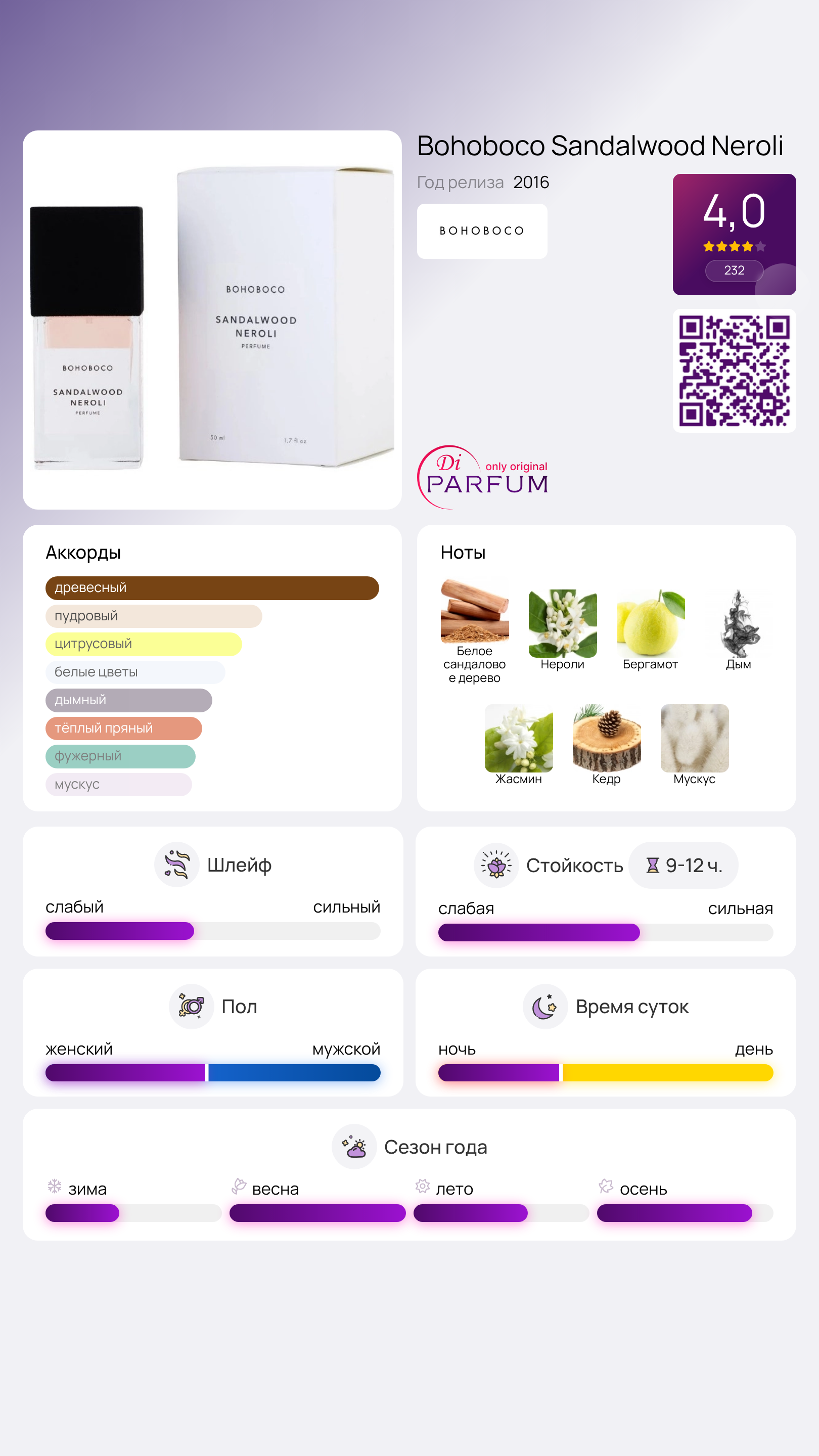 Sandalwood Neroli от Bohoboco — это притягательный и магнетически привлекательный аромат для тех, кто ценит уникальную и элегантную парфюмерную роскошь.
