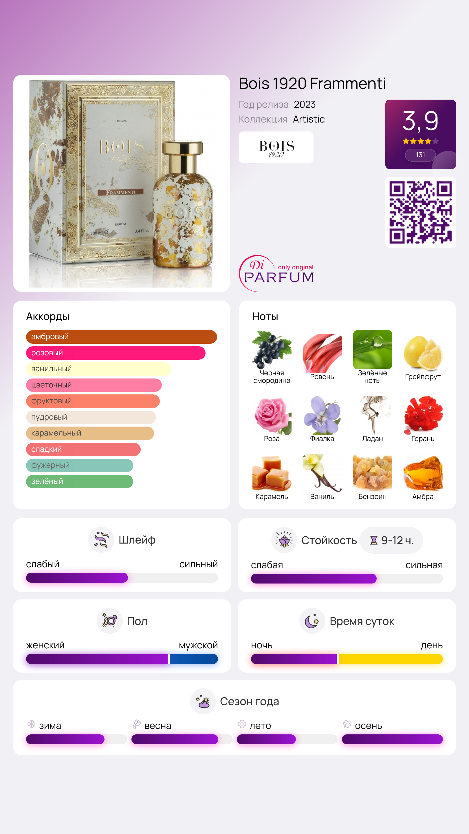 Шлейф аромата наполняется пленительными нотами ванильного бензоина и амброво-мускусного очарования, разжигая вашу страсть. Композиция Frammenti от Bois 1920 была впервые представлена в 2023 году как «уникальная новинка» в рамках линейки Artistic на Миланском выставочном мероприятии. Данная формула доступна в виде духов и парфюмерной воды, а фирменный флакон выполнен в эффектных золотых оттенках.