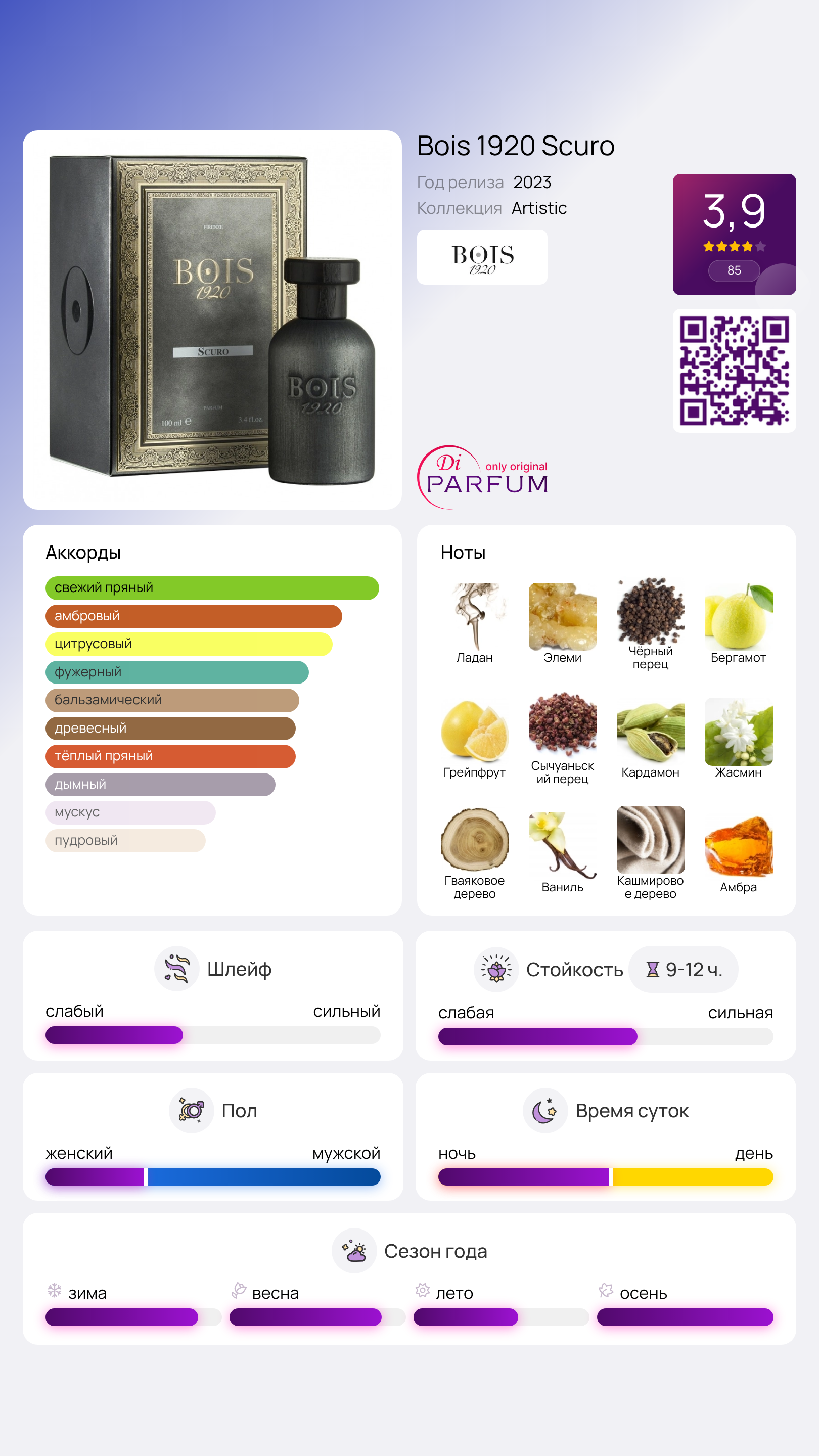 Аромат Scuro от Bois 1920 стал одной из первых работ коллекции Artistic, представленным итальянским брендом в 2023 году. Этот уникальный аромат оставляет незабываемое впечатление и уносит в мир безмятежности и вдохновения.