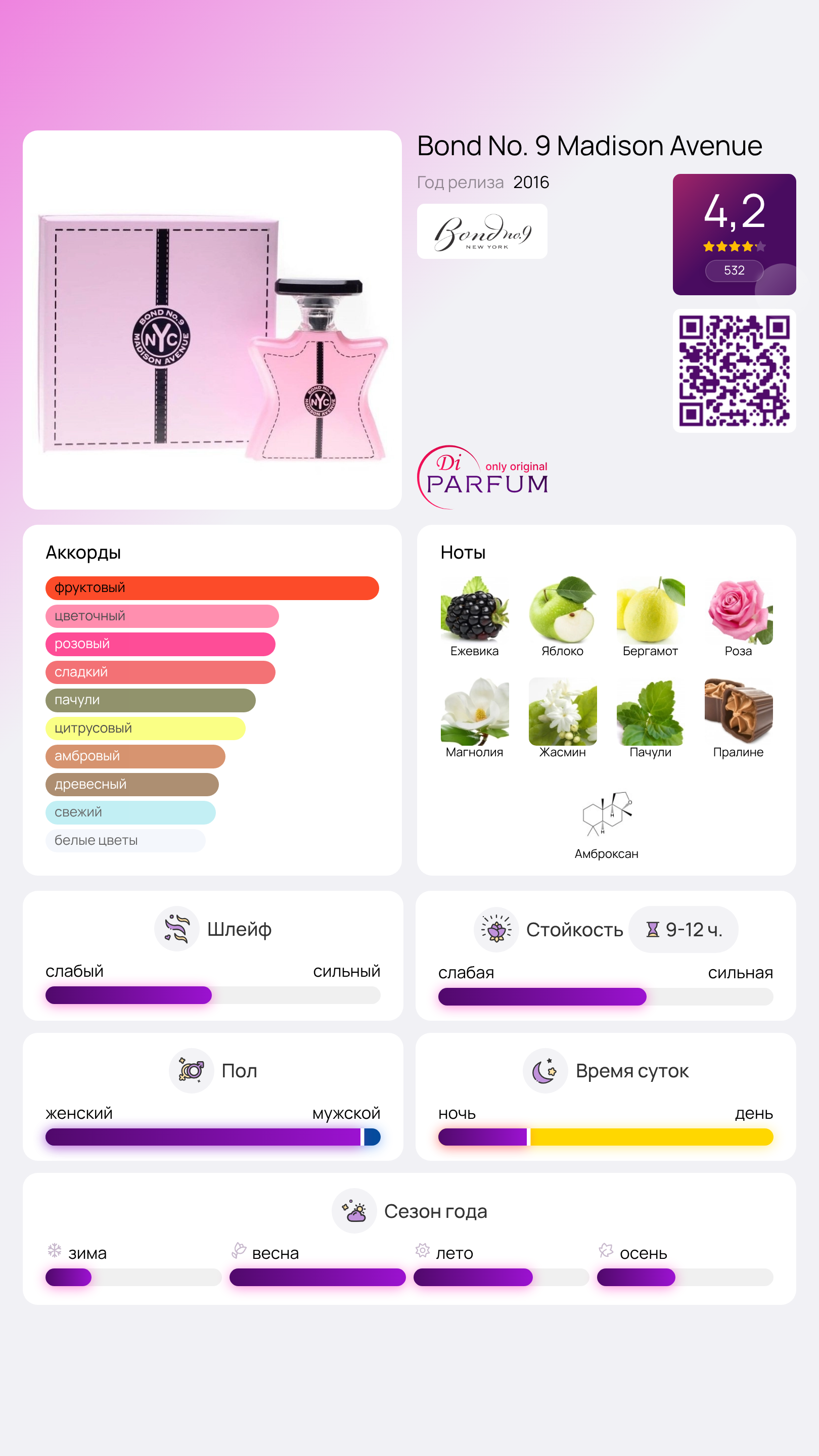 Ароматы способны существенно влиять на эмоциональное состояние, и парфюм Madison Avenue от Bond No. 9 ярко это демонстрирует. Он наполняет сердца радостью, придает окружающему миру яркие оттенки и помогает избавиться от негативных чувств.
