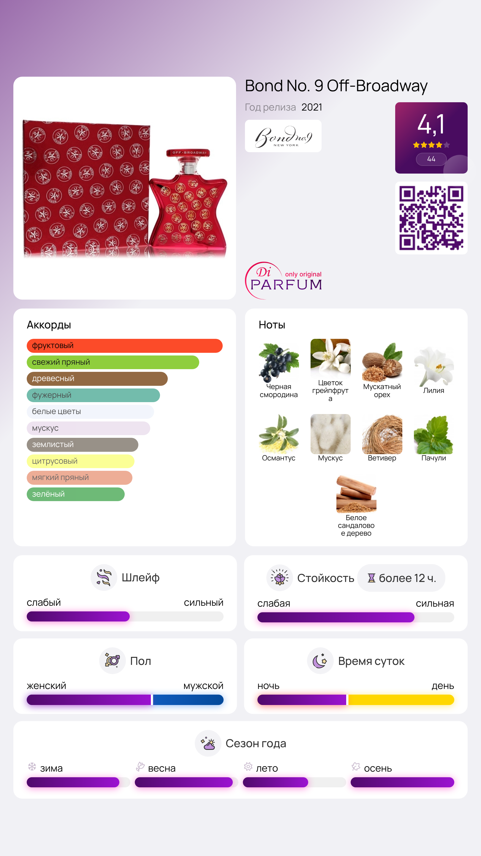 Off-Broadway подойдет для любых случаев — от повседневного использования до особых мероприятий. Он оставляет за собой лёгкий след и создаёт атмосферу тепла и уюта, благодаря чему этот аромат станет отличным выбором для тех, кто ценит качество и индивидуальность.
