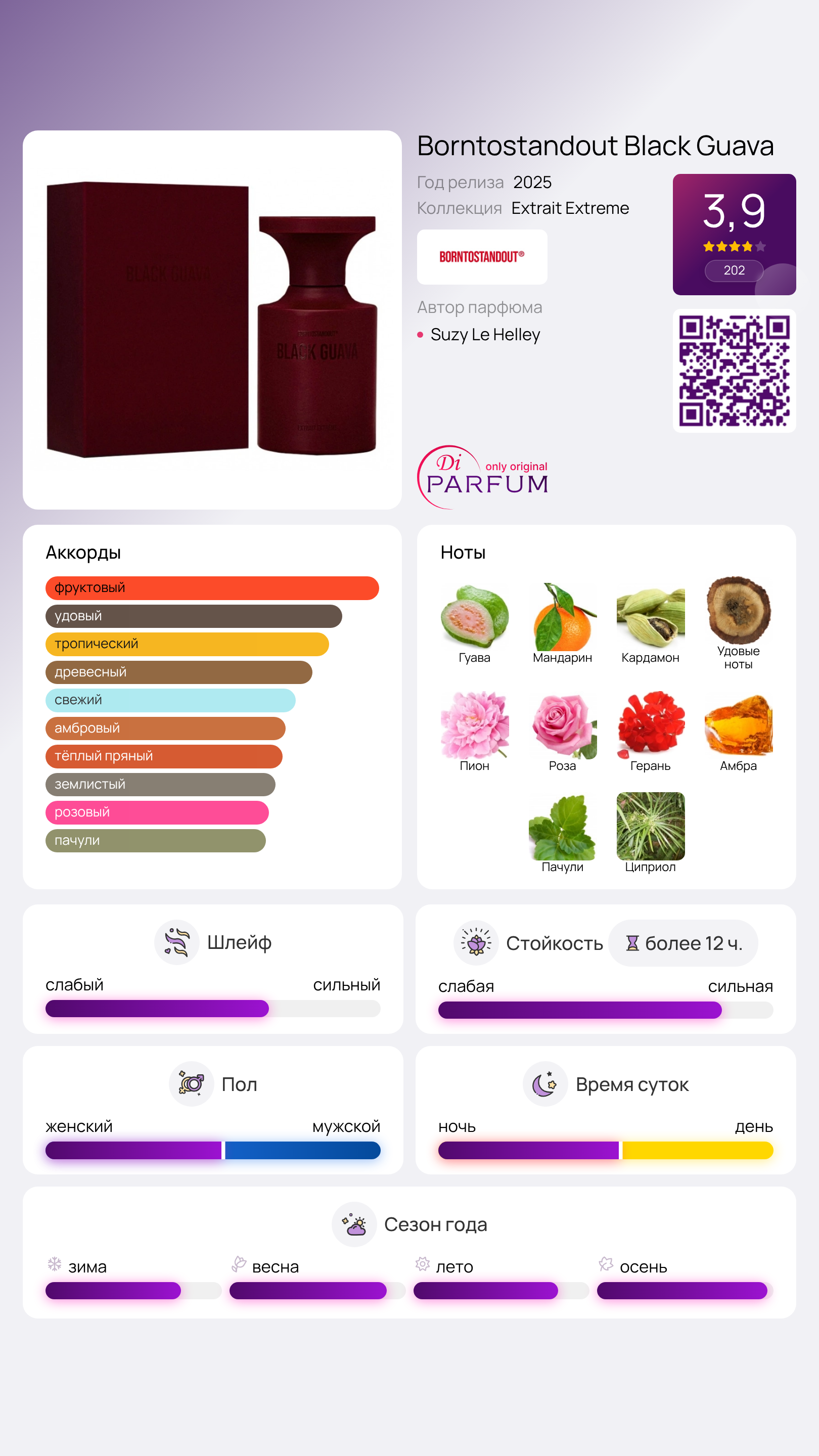 В финале амбра и нагармота добавляют теплоту, а пачули придают глубину. Этот аромат притягателен для летних вечеров благодаря своему «темному» шлейфу. Сначала он пленяет яркими фруктовыми акцентами, а затем раскрывает цветочно-смолистую чувственность. Borntostandout Black Guava — это не просто фруктовый аромат, это напоминание о том, что даже в насыщенной сладости есть место загадке.
